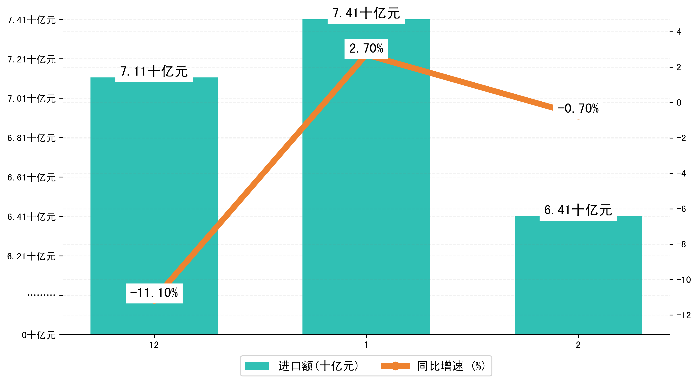 以人民币计,2024年2月昆明市进口额为64,1225.3914万元,相比上月减少了9,9657.4161万元;相比上年同期减少了3,5204.7209万元,同比减少了-0.70%。