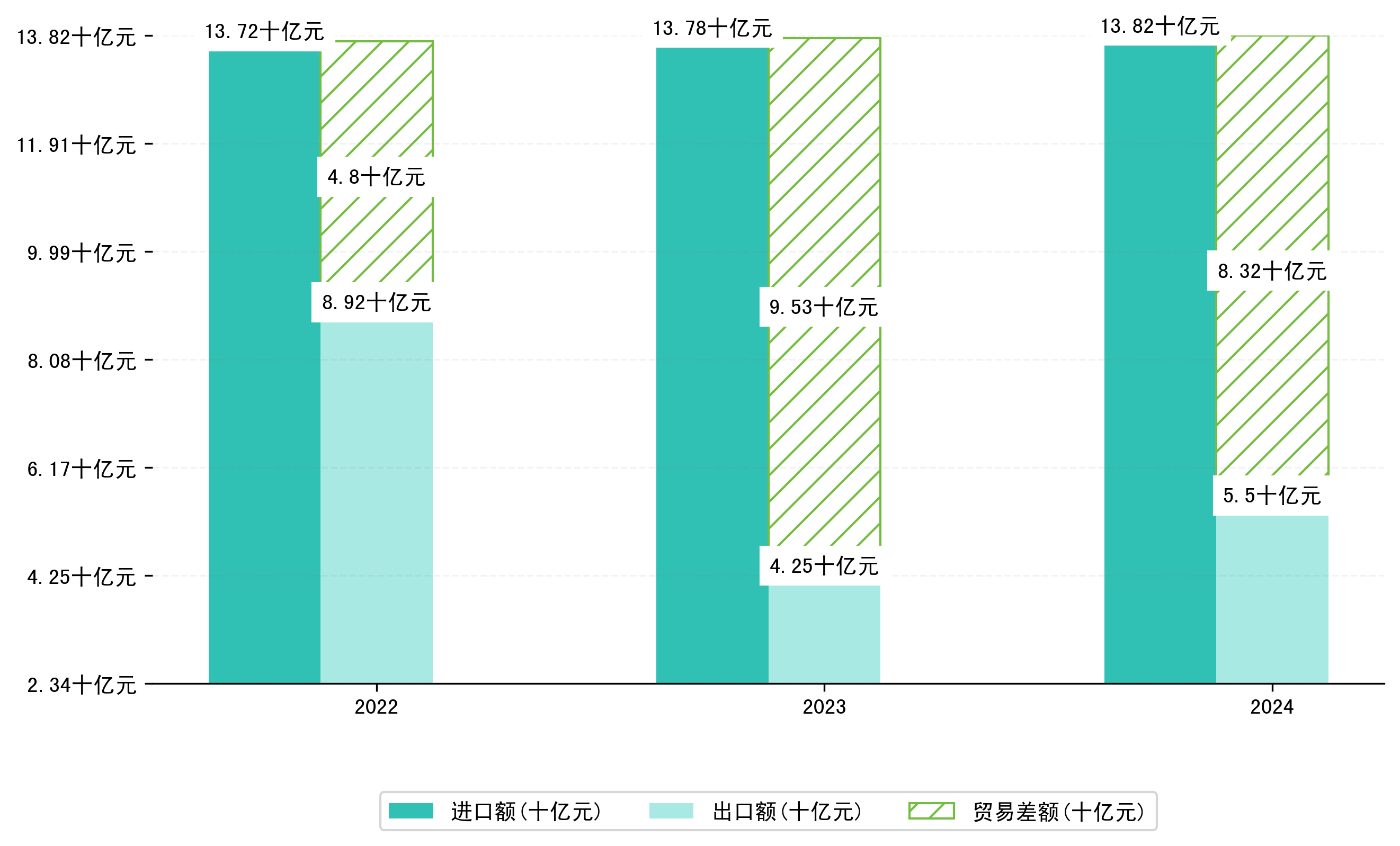 以人民币计,2024年1-2月昆明市贸易差额为83,2286,8529万元(贸易逆差),相比上年同期增加了12,0355,0417万元,同比增加-12.63%。