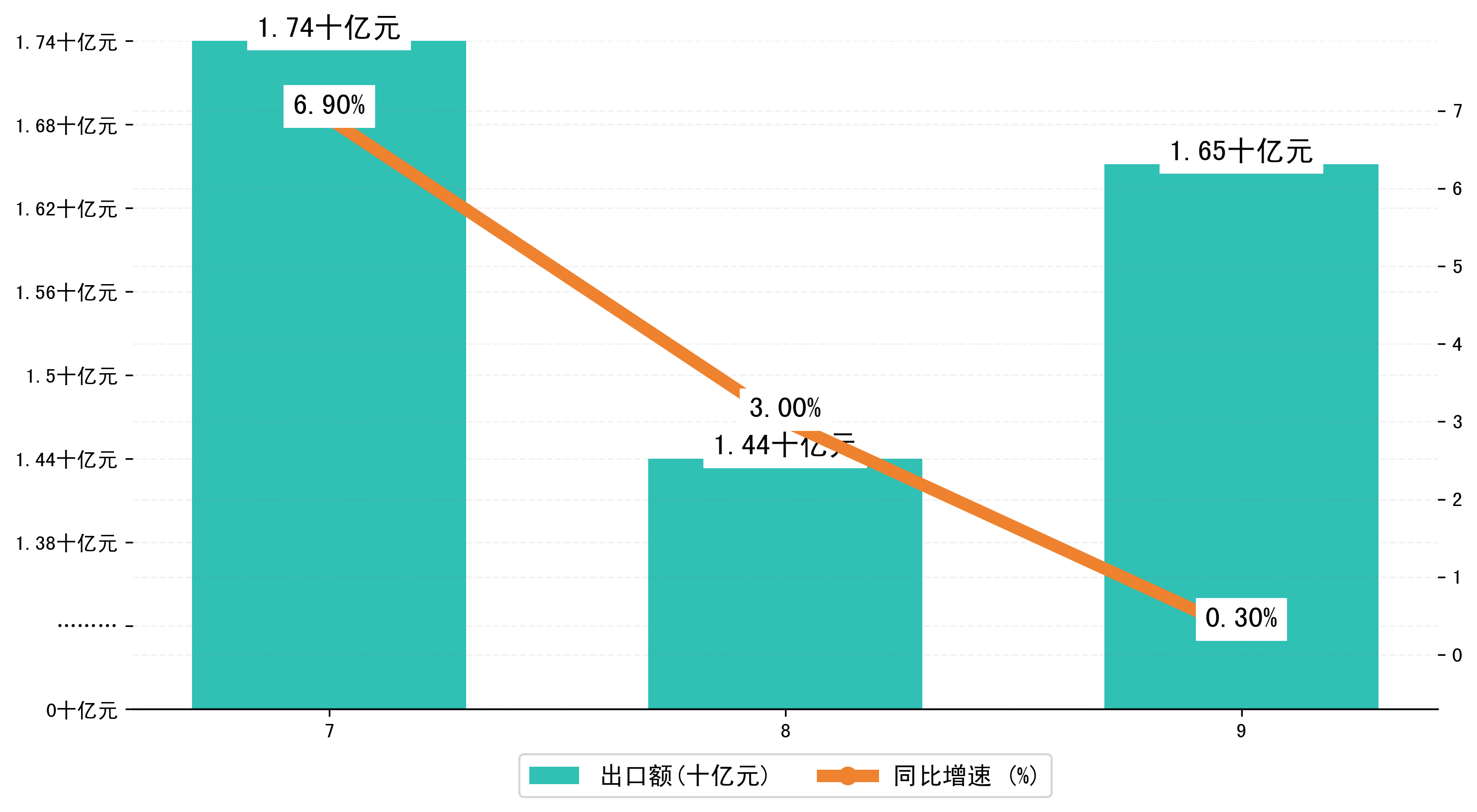 以人民币计,2023年9月廊坊市出口额为16,5238.1463万元,相比上月增加了2,1348.3009万元;相比上年同期减少了3,3747.1314万元,同比增加了0.30%。