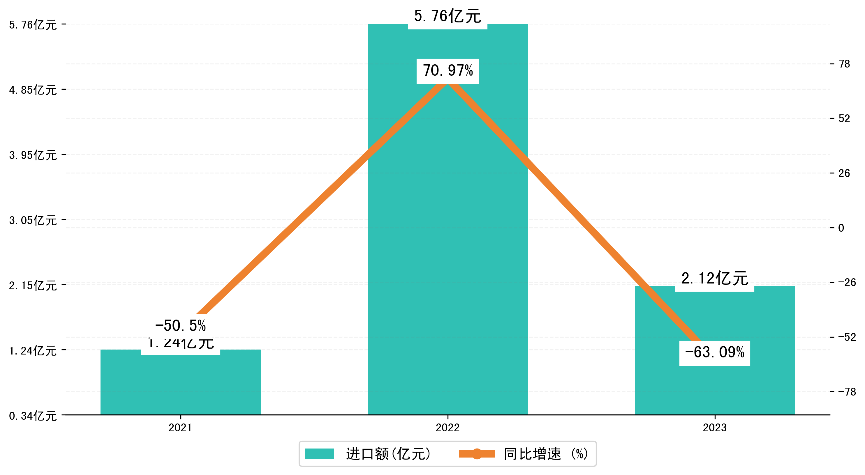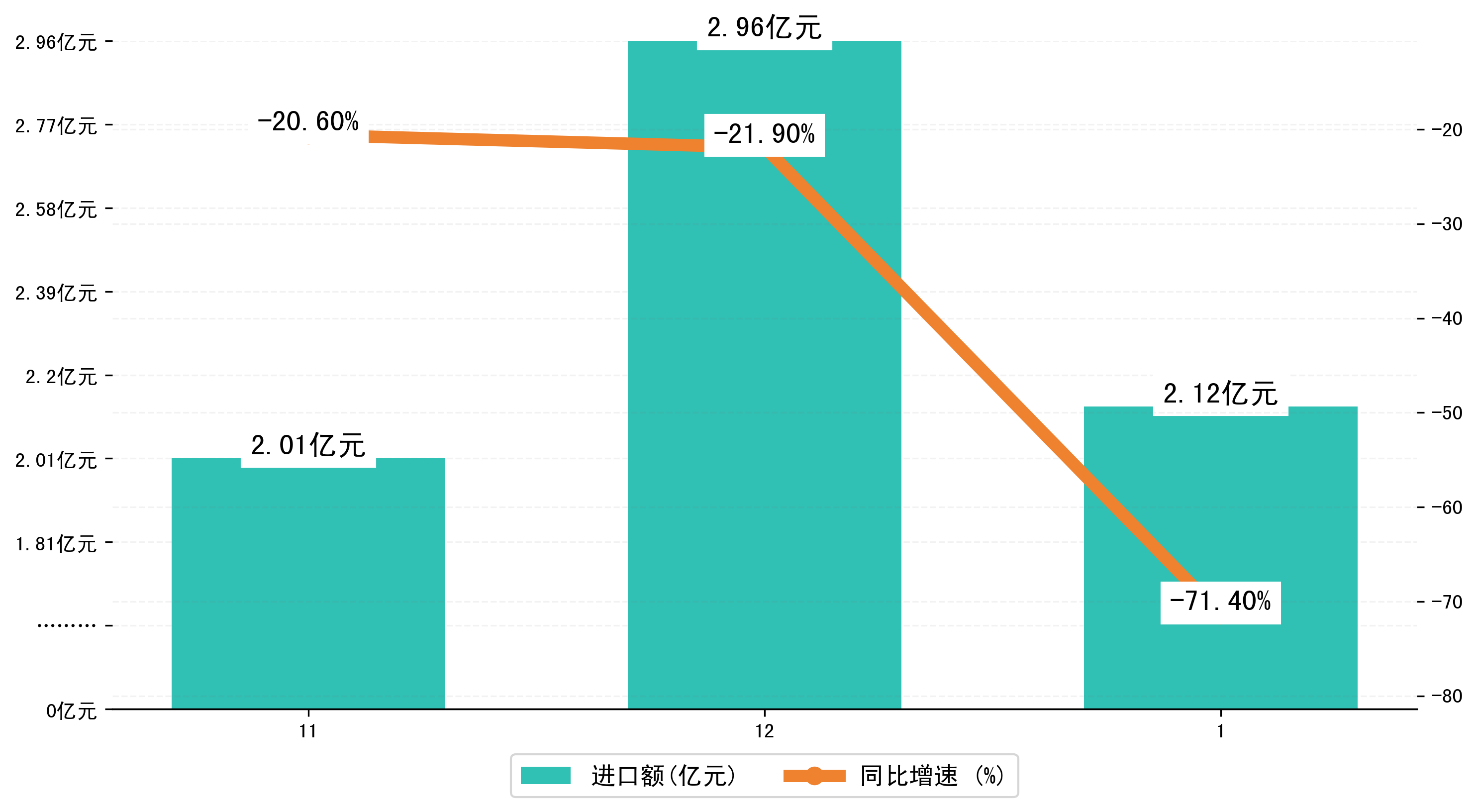 以人民币计,2023年1-1月洛阳市进口额为2,1241.6681万元,相比上年同期减少了3,6311.998万元,同比减少了-71.40%。