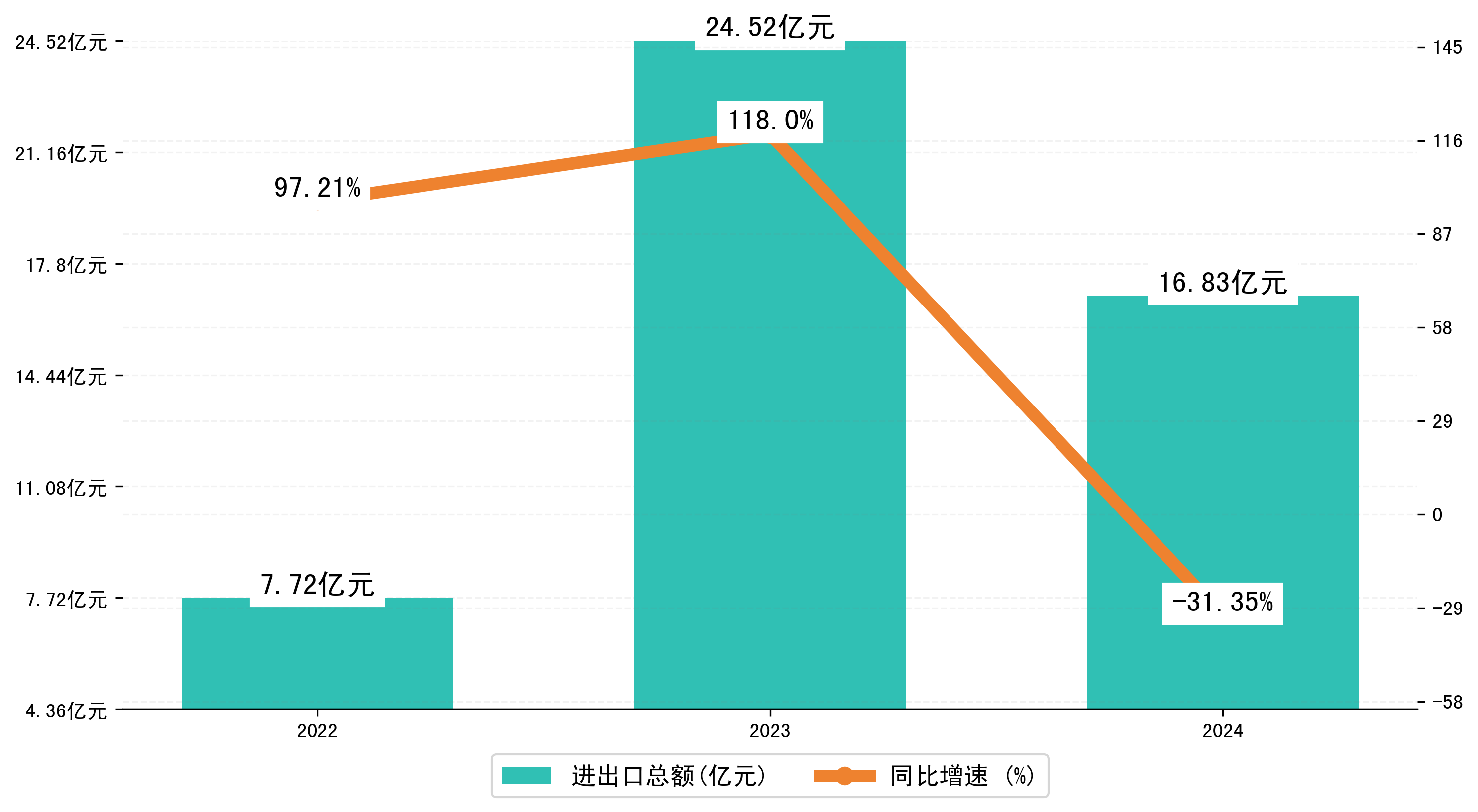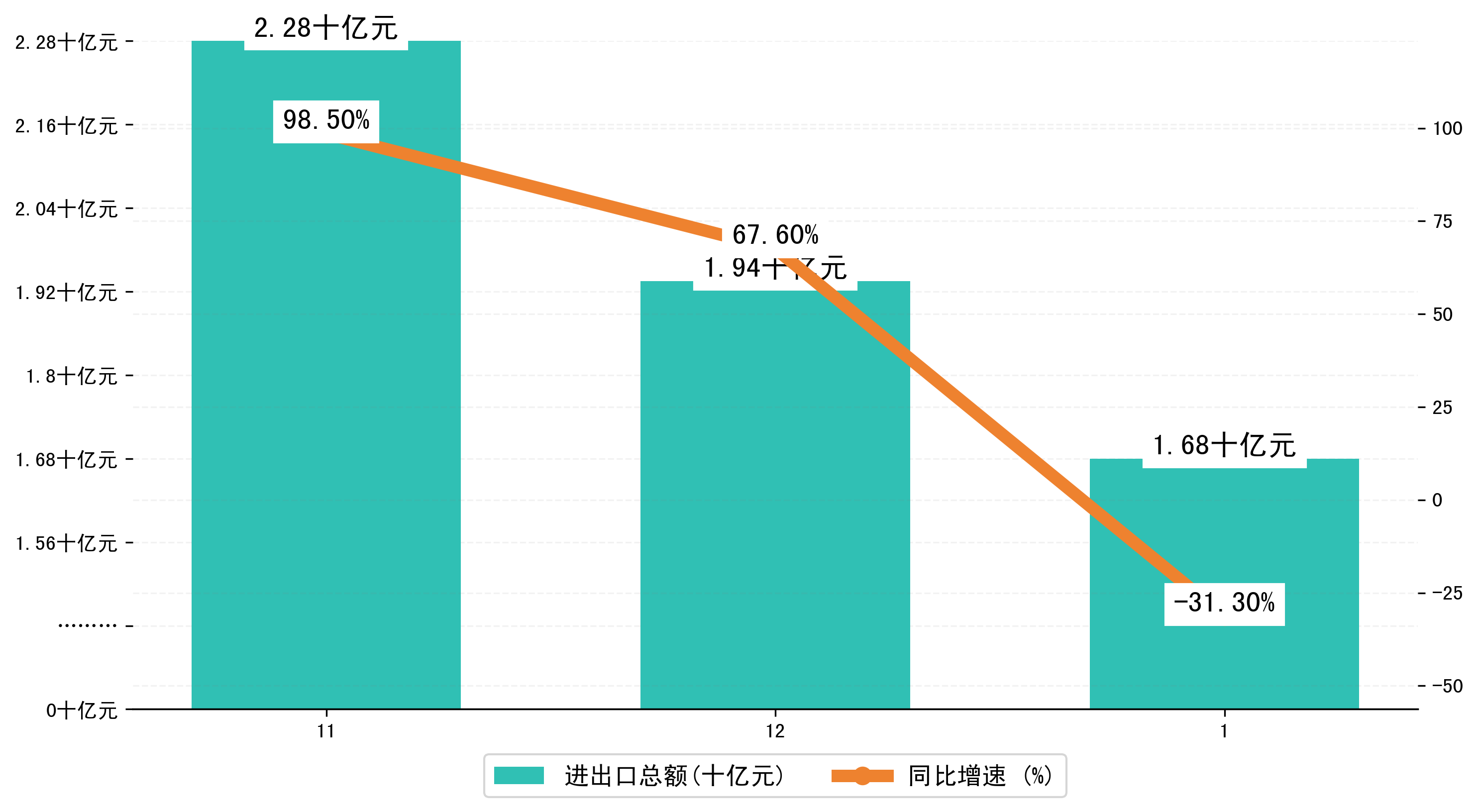 以人民币计,2024年1-1月满洲里市进出口总额为16,8348.8901万元,相比上年同期减少了7,6871.5427万元,同比减少了-31.30%。