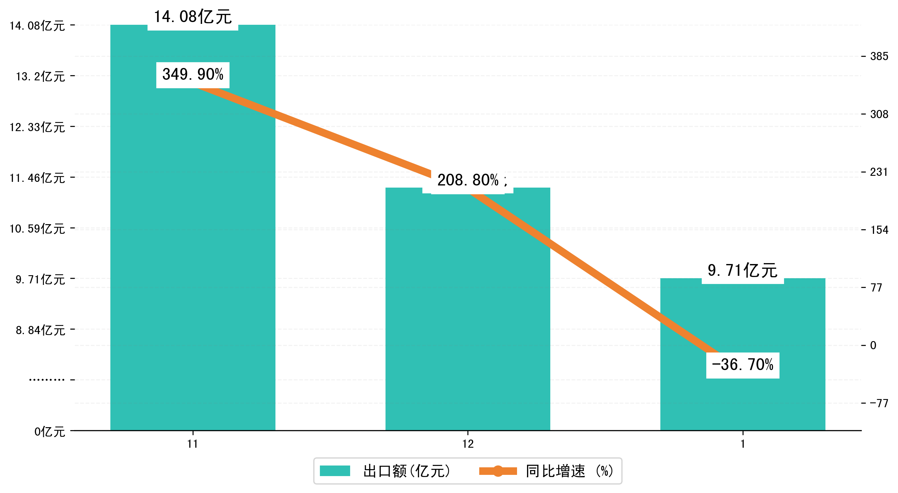以美元计,2024年1-1月满洲里市出口额为1,3711.3538万美元,相比上年同期减少了8271.8881万美元,同比减少-37.60%。
