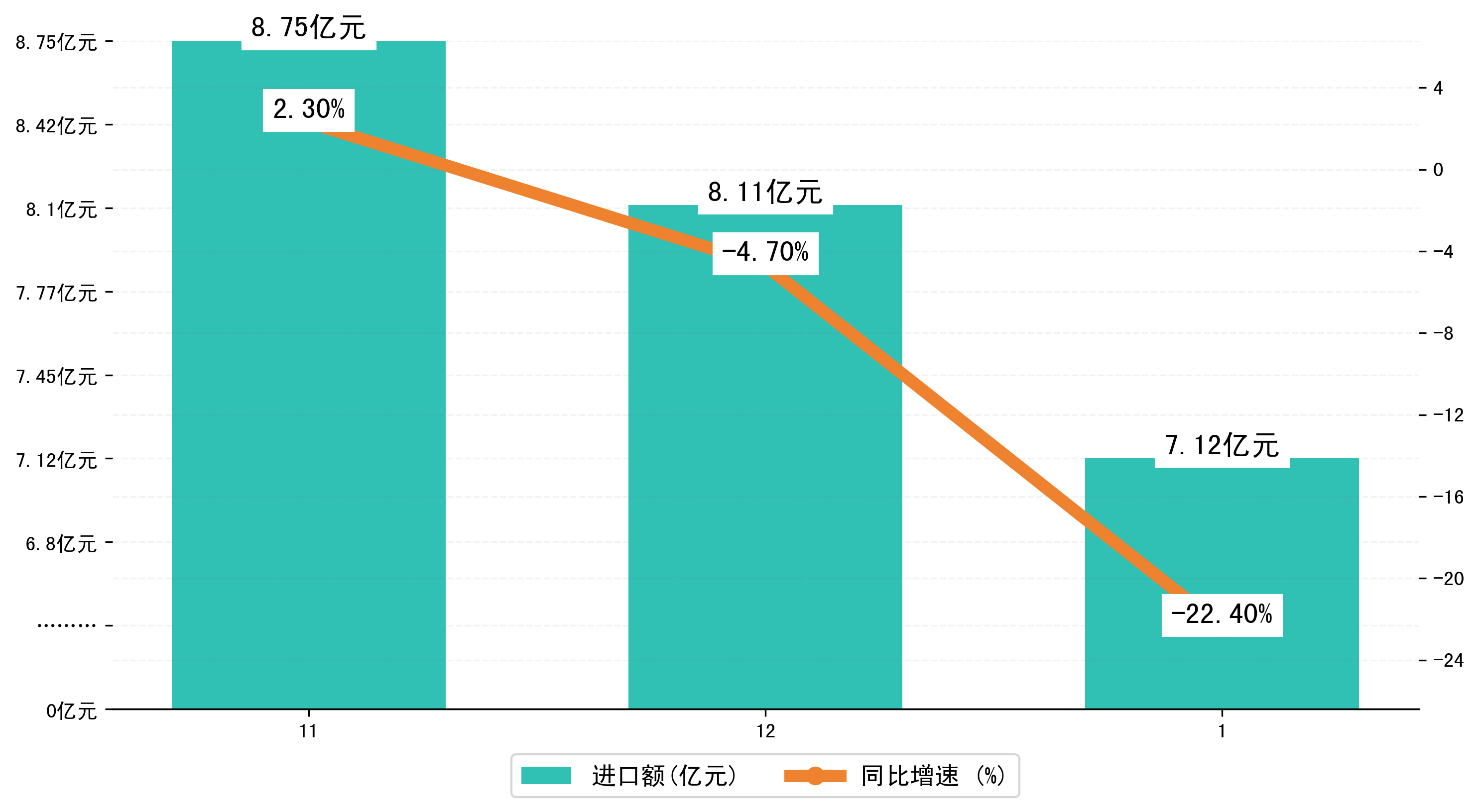 以美元计,2024年1-1月满洲里市进口额为1,0062.4525万美元,相比上年同期减少了3002.4949万美元,同比减少-23.00%。