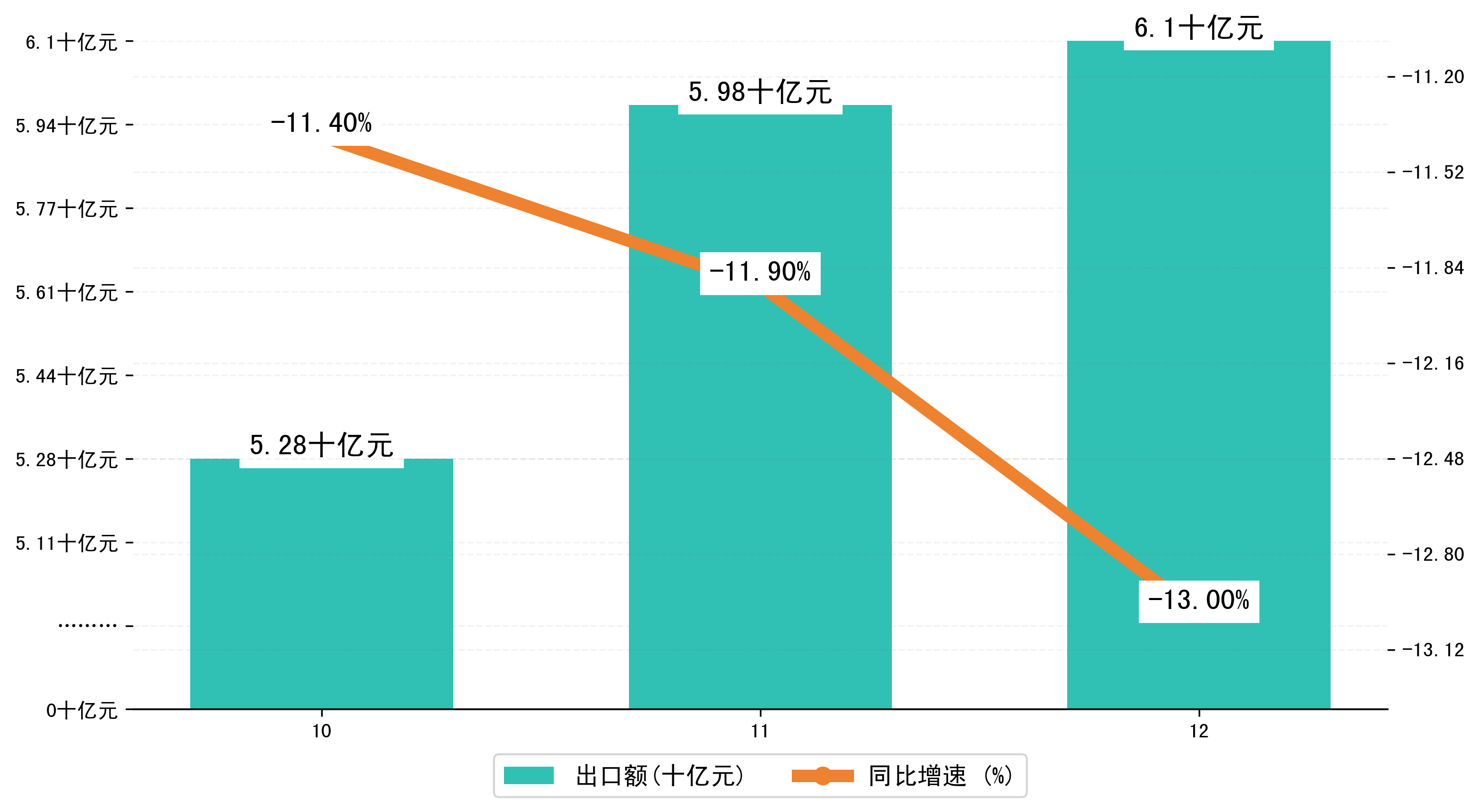 以人民币计,2023年12月南昌市出口额为61,0408.9089万元,相比上月增加了1,2741.8849万元;相比上年同期减少了10,2039.6421万元,同比减少了-13.00%。