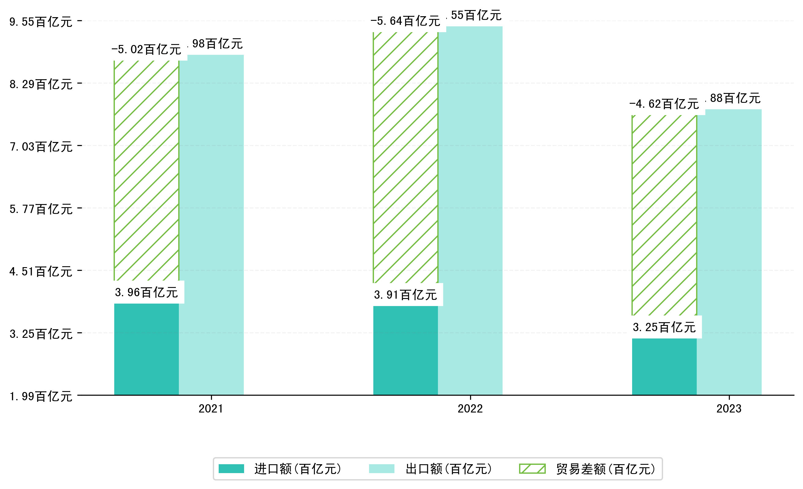 以人民币计,2023年1-12月南昌市贸易差额为462,3378,0076万元(贸易顺差),相比上年同期减少了101,8887,5005万元,同比减少-18.06%。