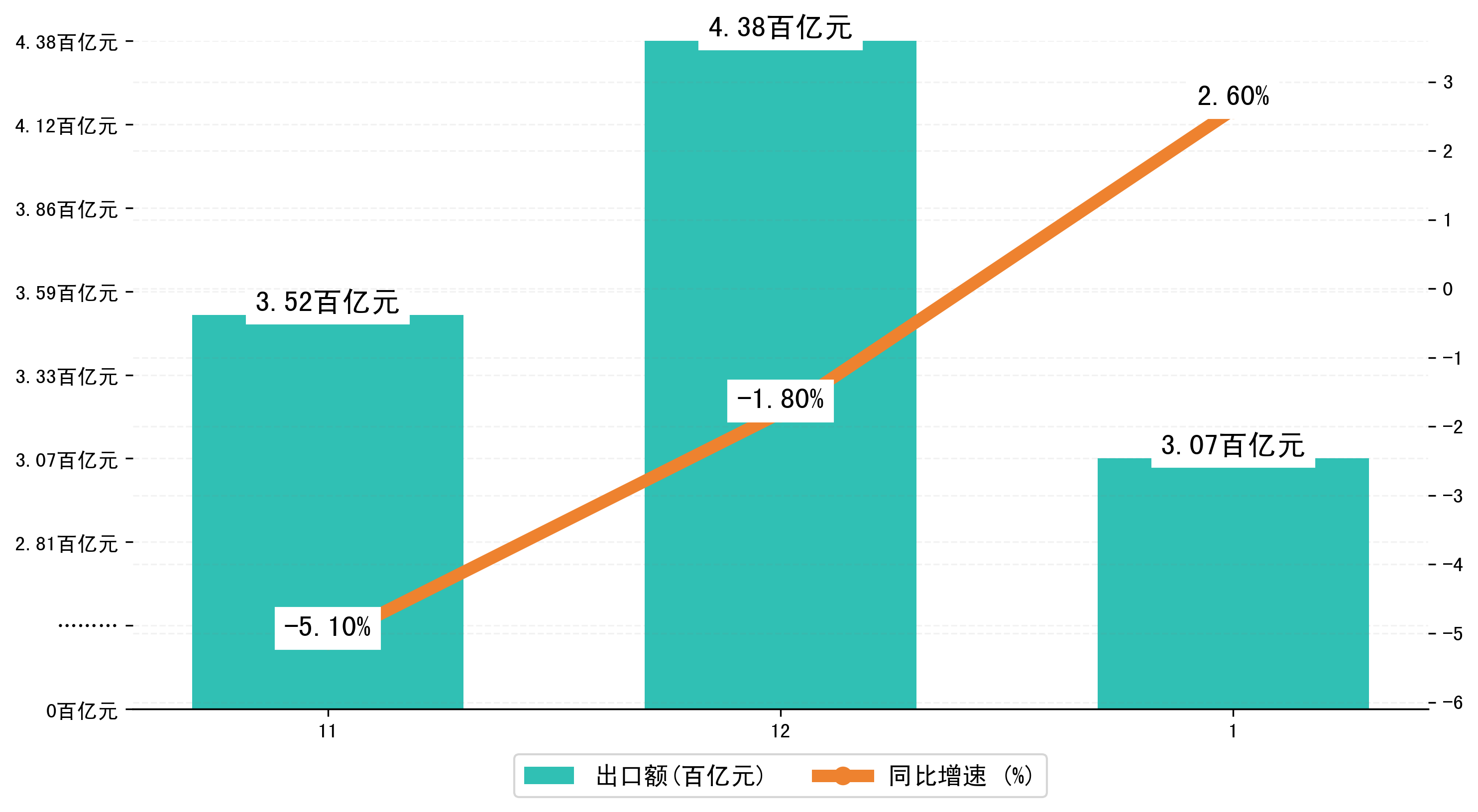 以人民币计,2023年1-1月南京市出口额为306,8827.443万元,相比上年同期减少了1,3520.3248万元,同比增加了2.60%。