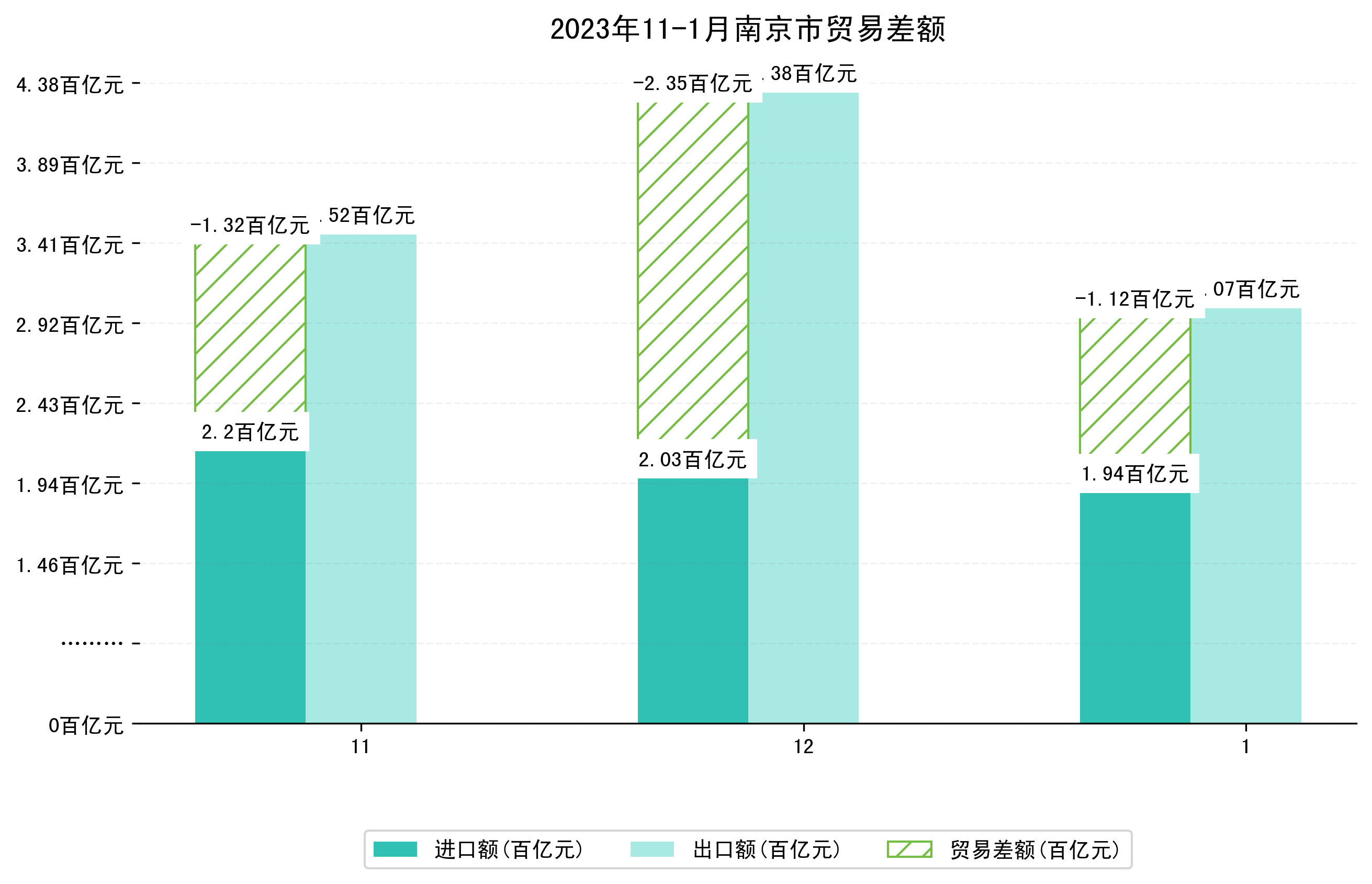 以人民币计,2023年1-1月南京市贸易差额为112,4932,2305万元(贸易顺差),相比上年同期增加了7,5384,2704万元,同比增加7.18%。