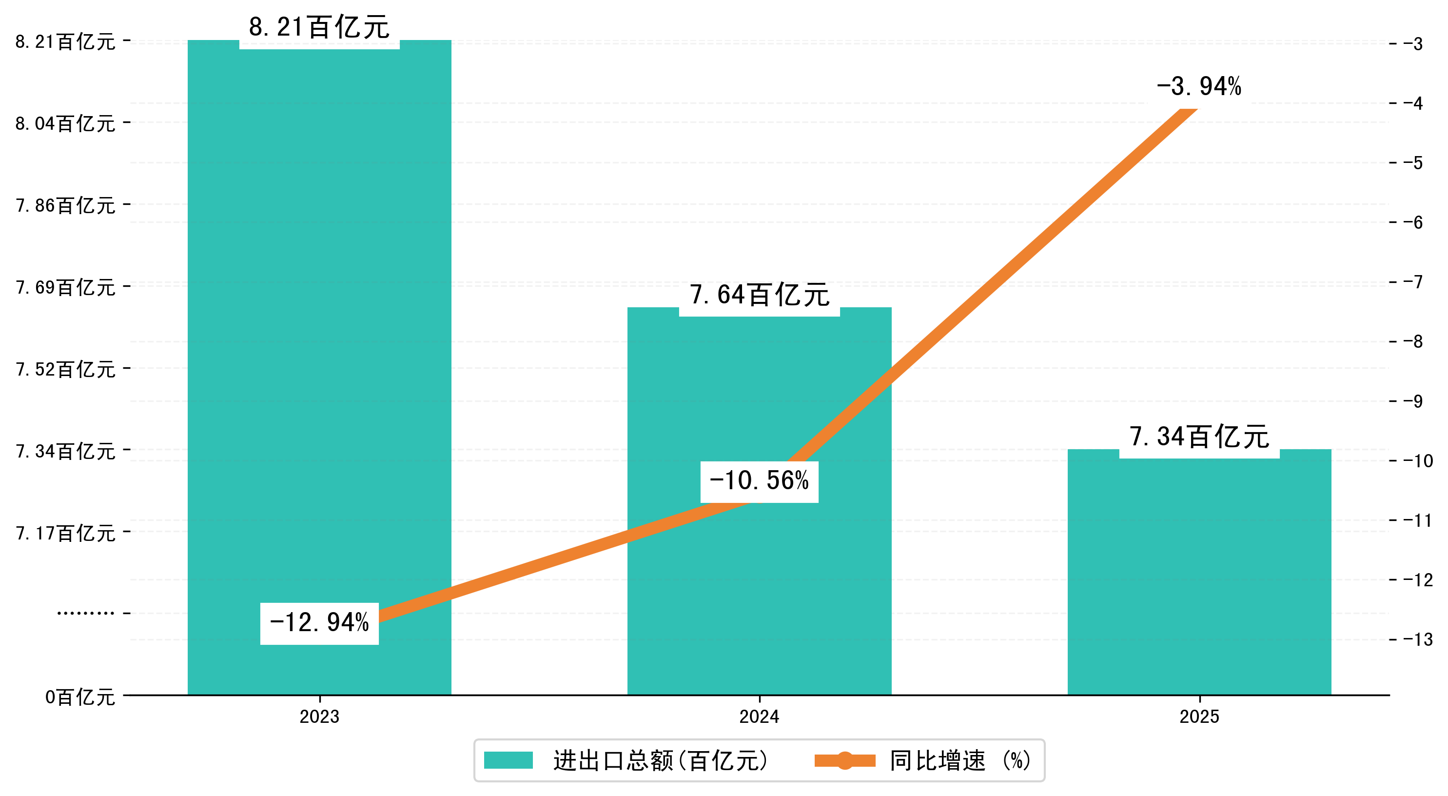 以人民币计,2025年1-7月日照市进出口总额为734,2805.7625万元,相比上年同期减少了30,0985.2307万元,同比减少了-2.30%。