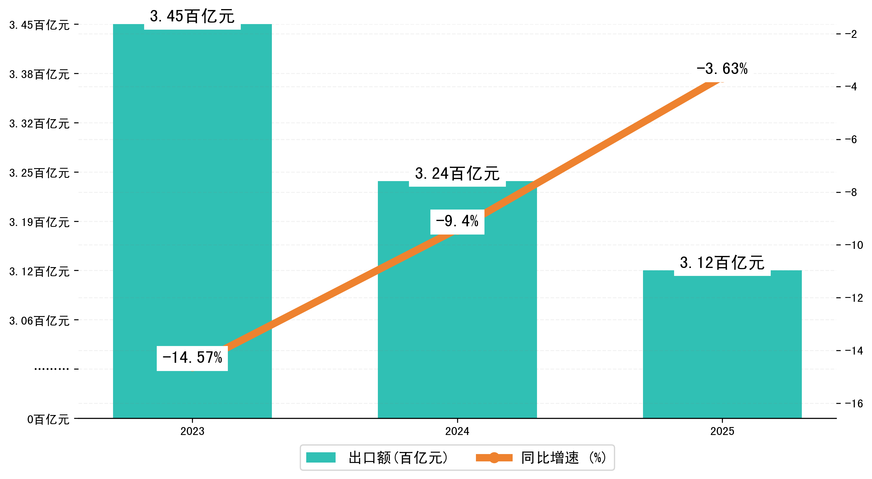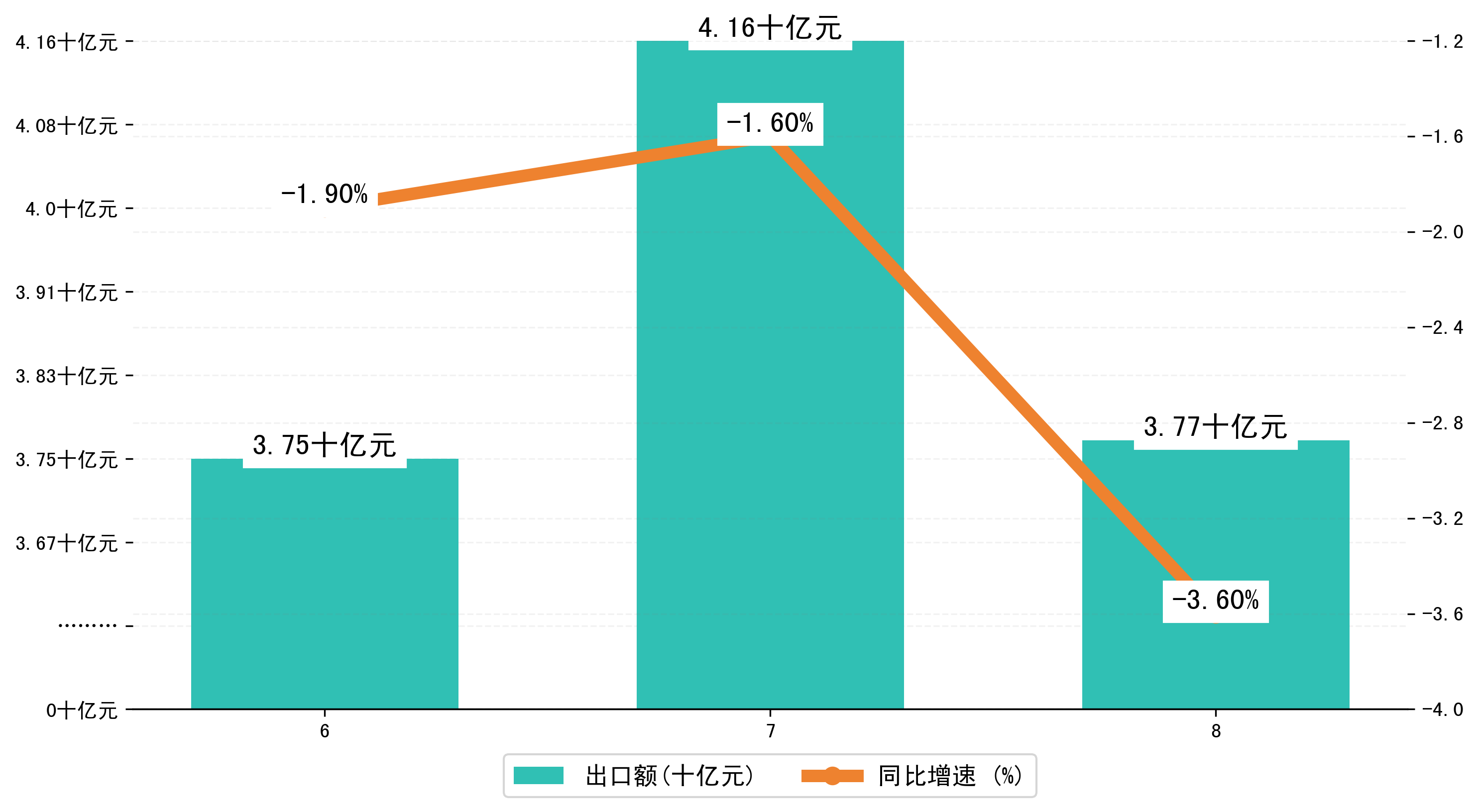 以人民币计,2025年1-8月日照市出口额为312,2875.3389万元,相比上年同期减少了11,7575.5965万元,同比减少了-3.60%。