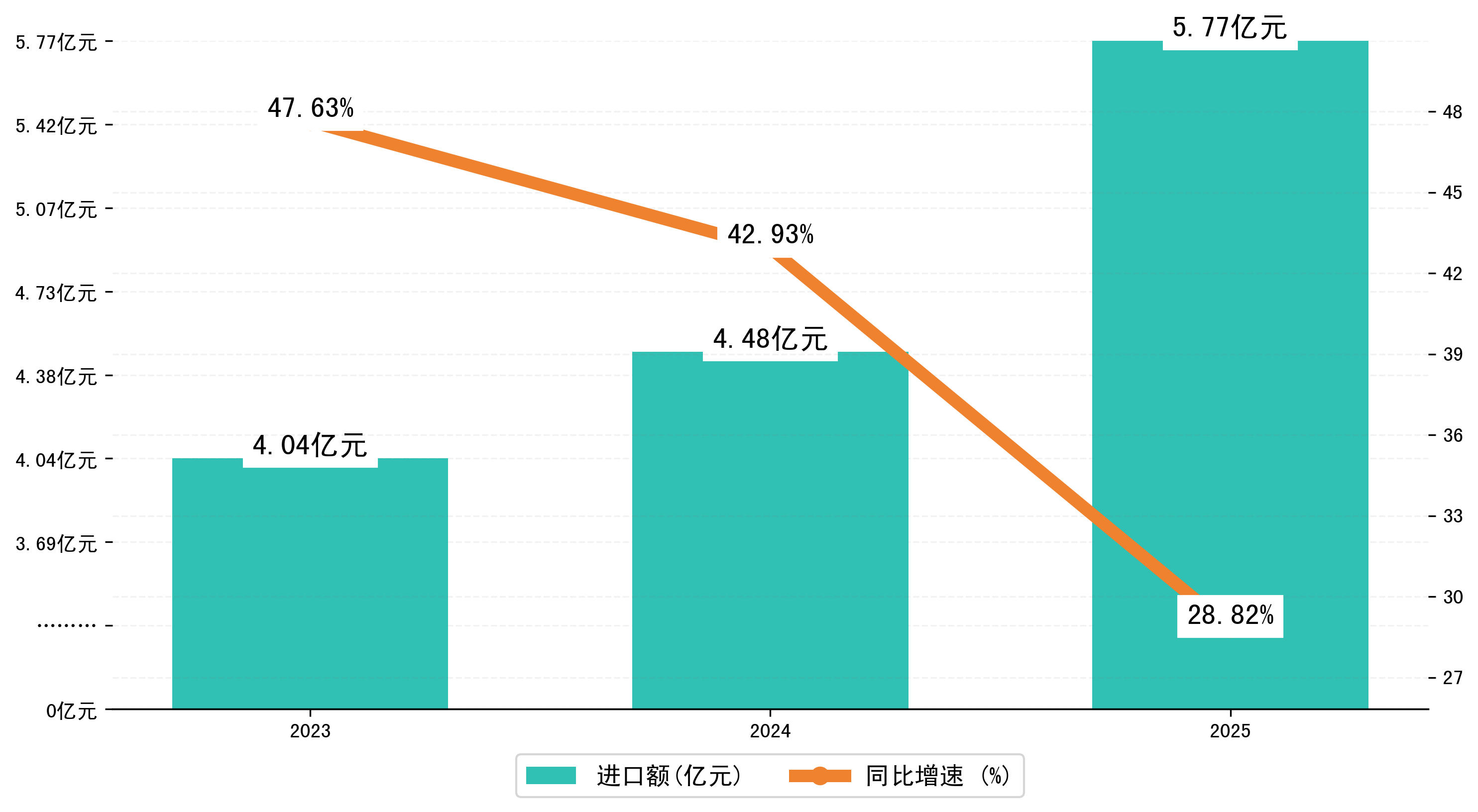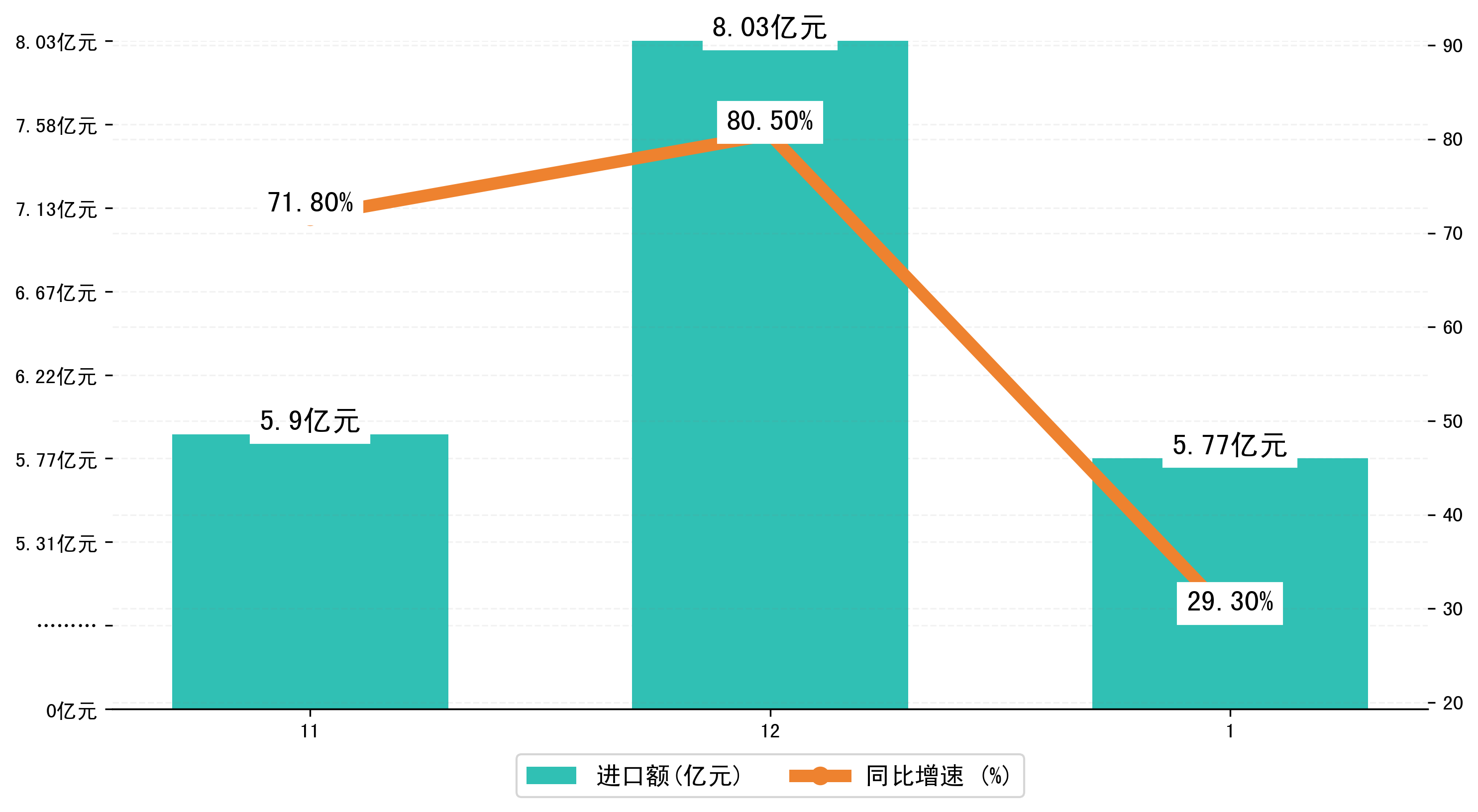 以美元计,2025年1-1月上饶市进口额为8019.6158万美元,相比上年同期增加了1718.7346万美元,同比增加27.70%。