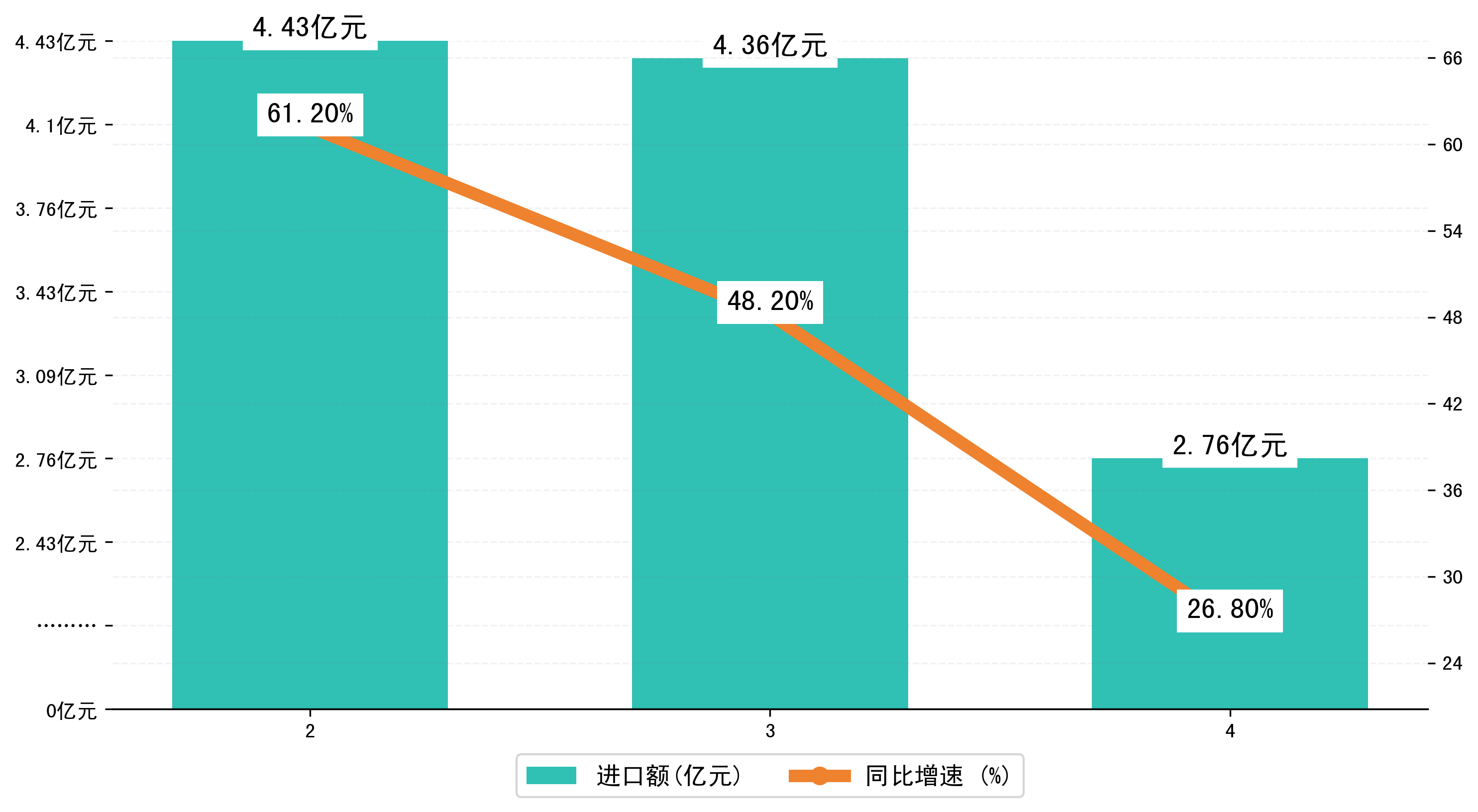以美元计,2023年1-4月上饶市进口额为2,2745.3396万美元,相比上年同期增加了2653.3142万美元,同比增加17.80%。
