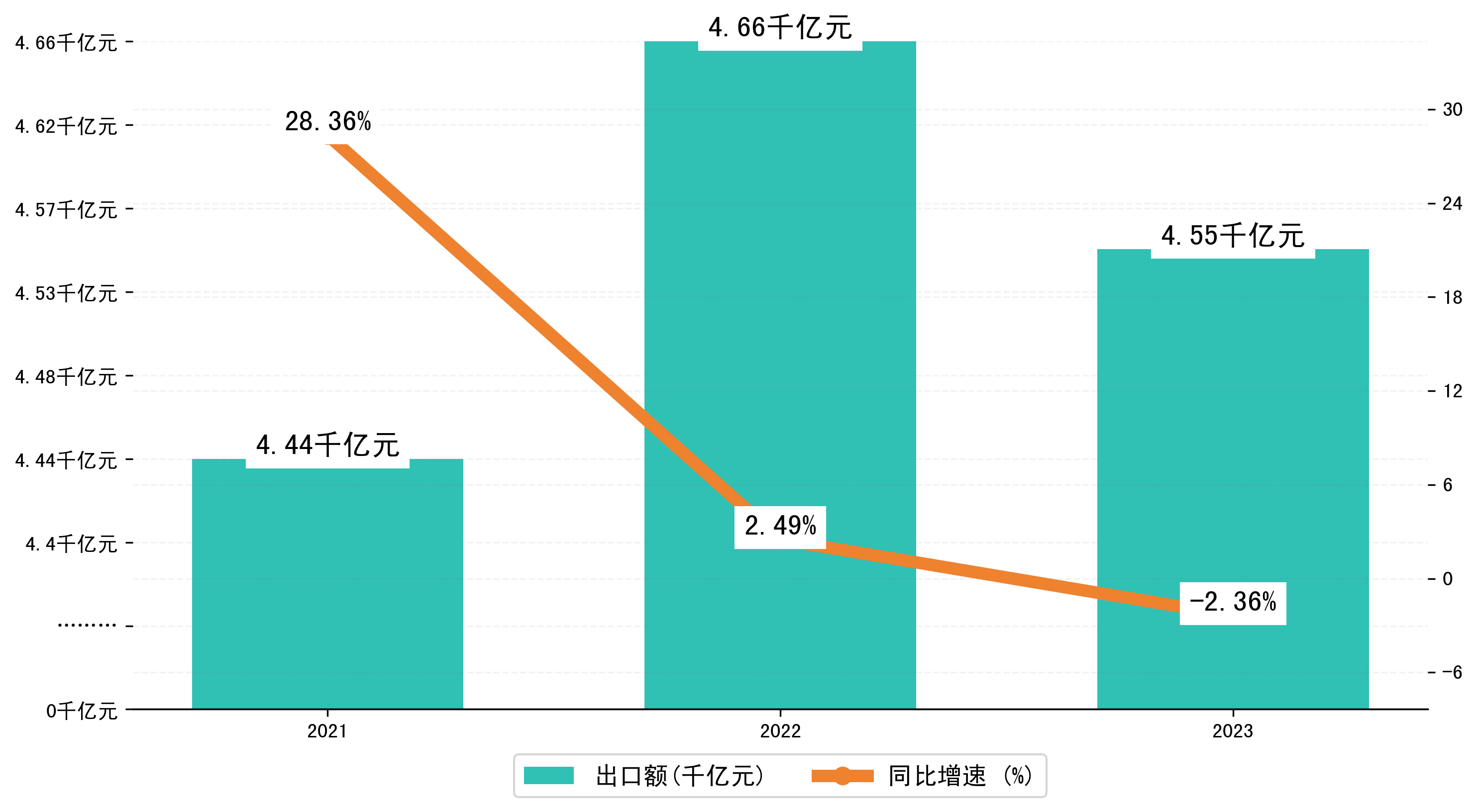 以人民币计,2023年1-4月苏州市出口额为4550,1484.7364万元,相比上年同期减少了109,8794.3354万元,同比减少了-2.40%。