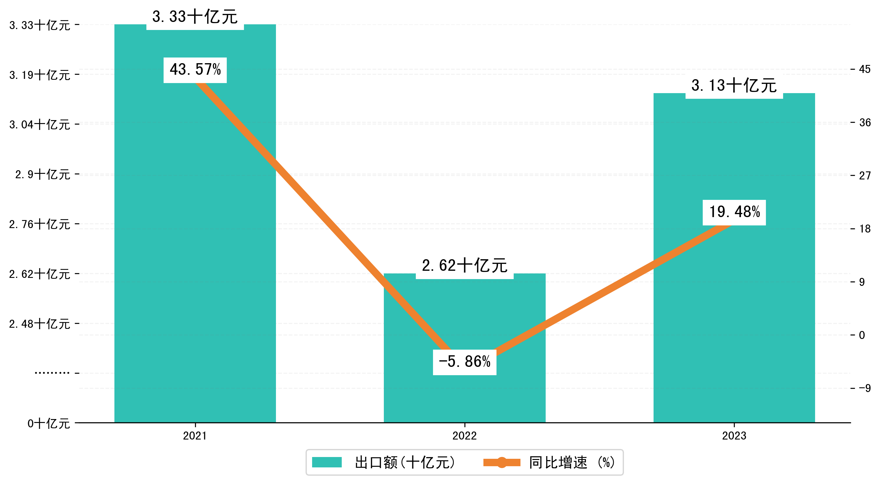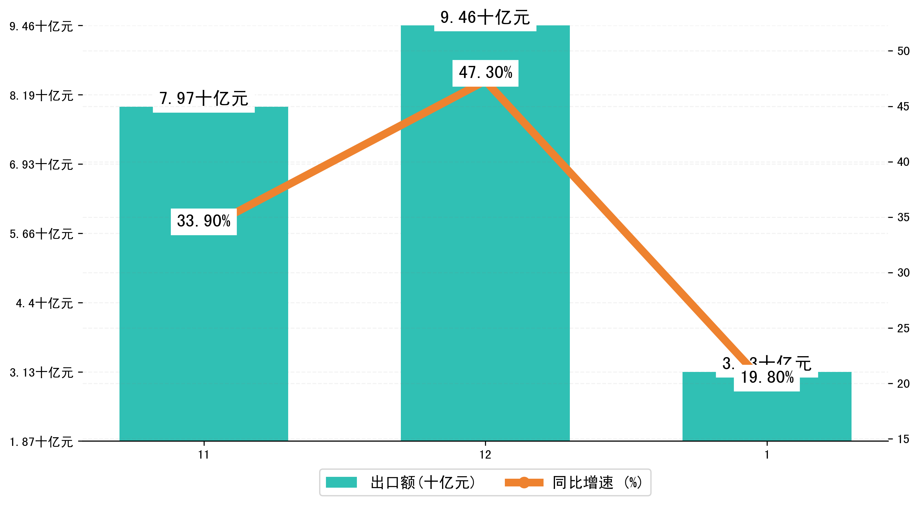 以美元计,2023年1-1月唐山市出口额为4,4814.132万美元,相比上年同期增加了3730.1913万美元,同比增加9.40%。