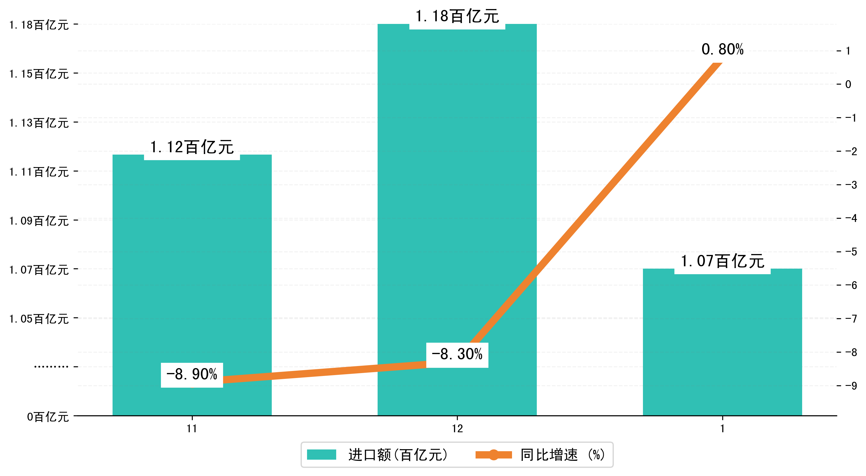 以人民币计,2023年1-1月唐山市进口额为107,0901.4889万元,相比上年同期增加了6,9399.1578万元,同比增加了0.80%。