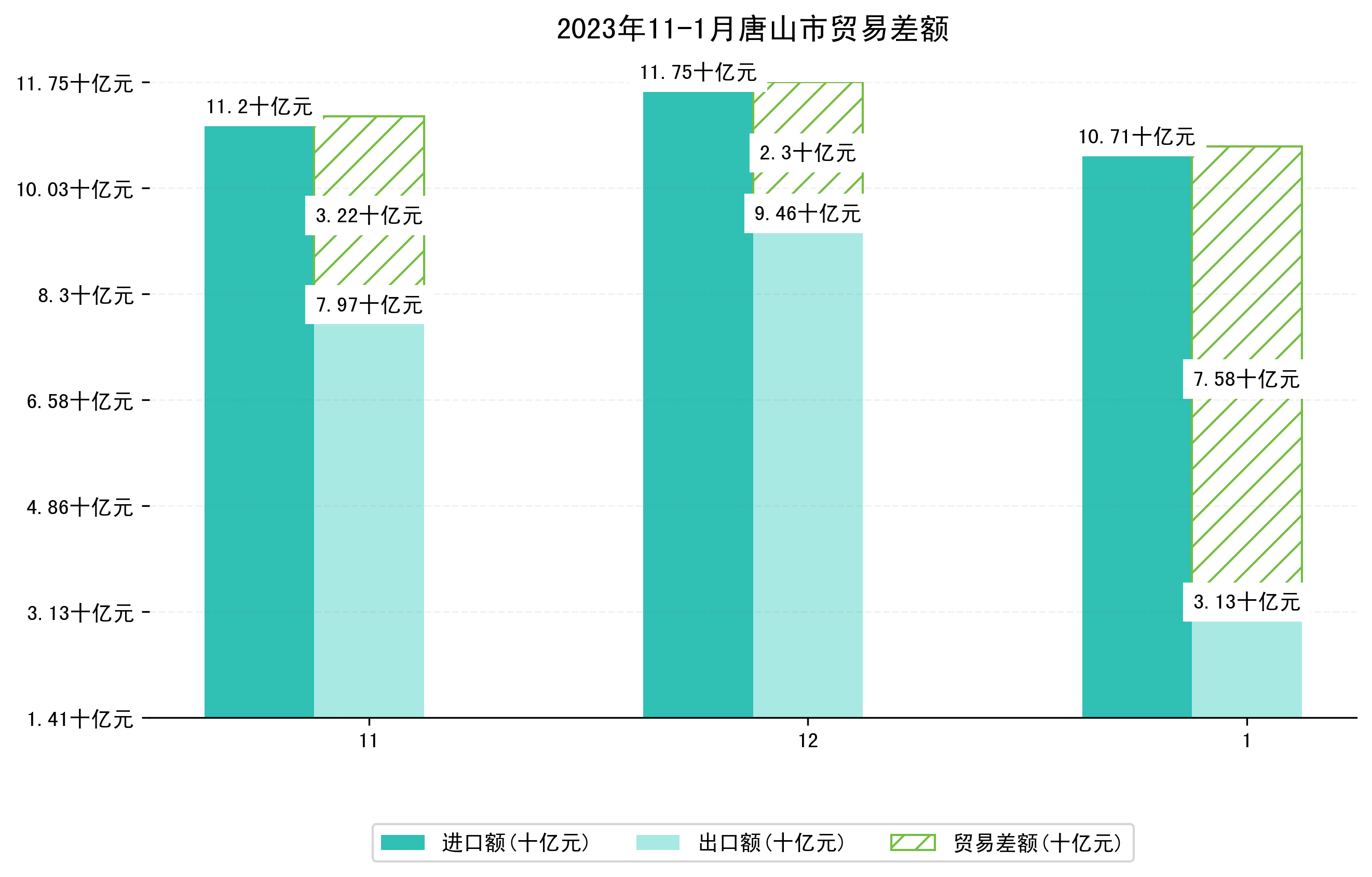 以美元计,2023年1-1月唐山市贸易差额为10,8691,9233万美元(贸易逆差),相比上年同期减少了7353,1156万美元,同比减少-6.34%。