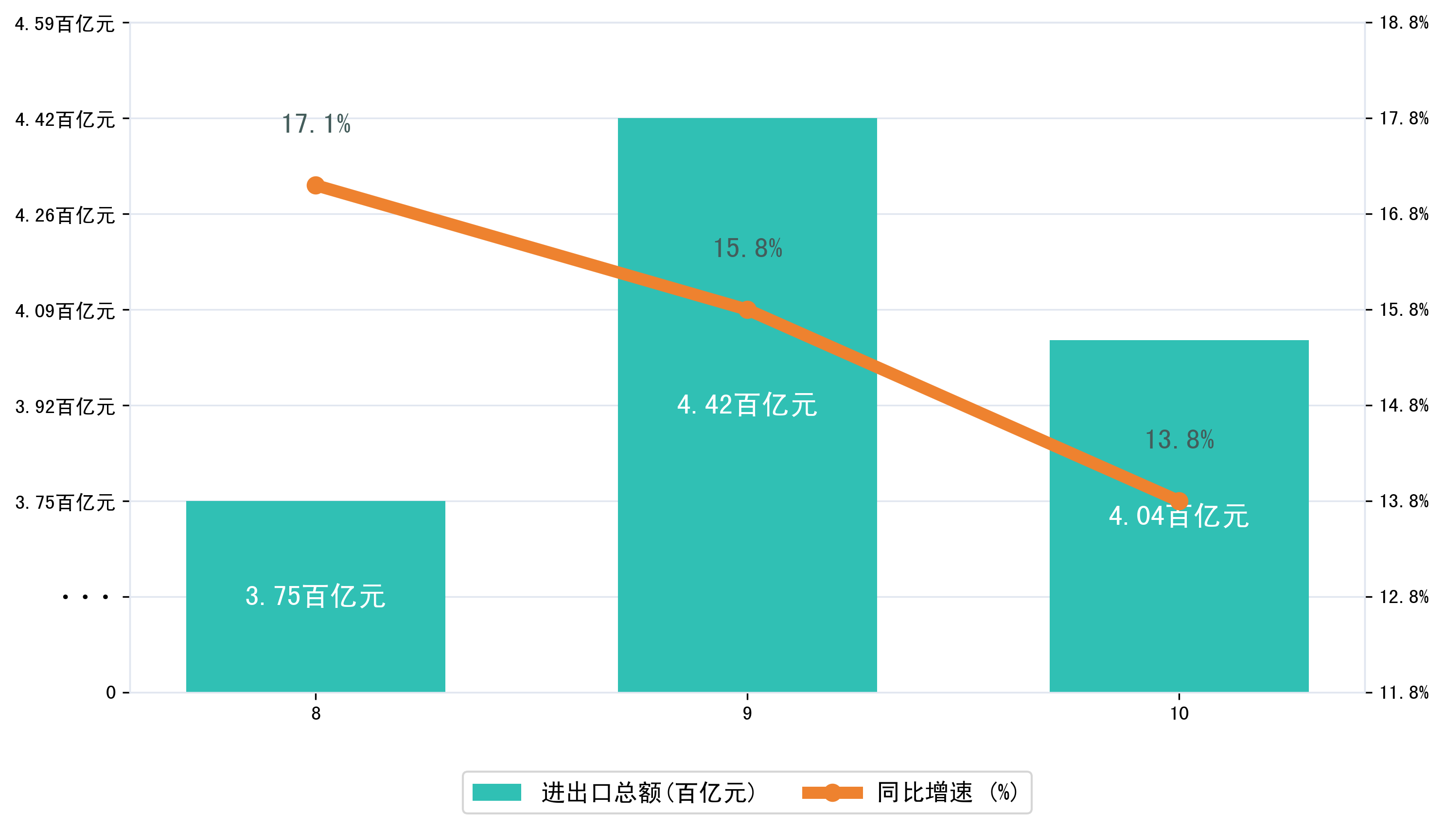 以人民币计,2025年10月武汉市进出口总额为403,6362.372万元,相比上月减少了38,8286.4958万元;相比上年同期减少了1924.71万元,同比增加了13.80%。