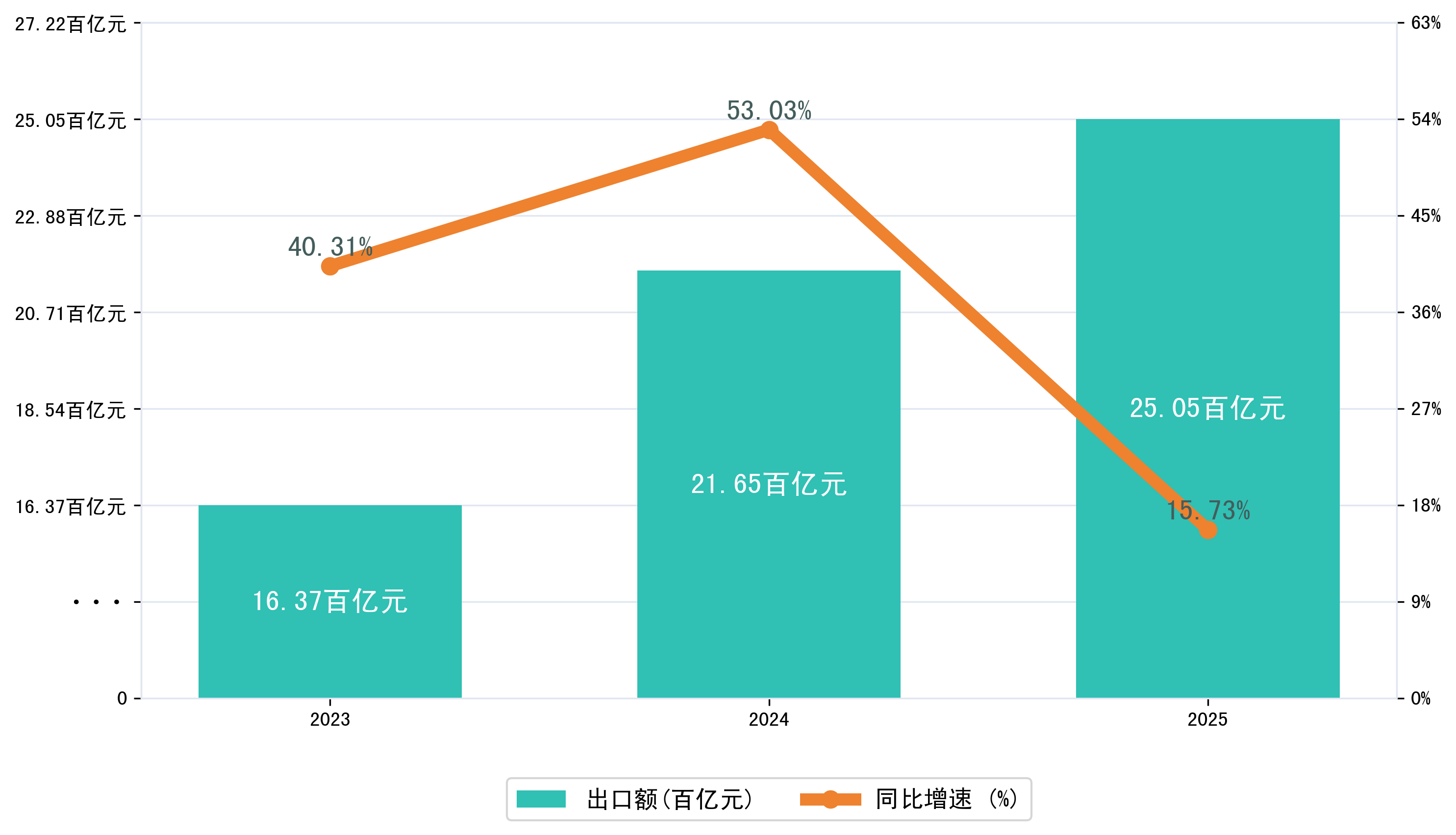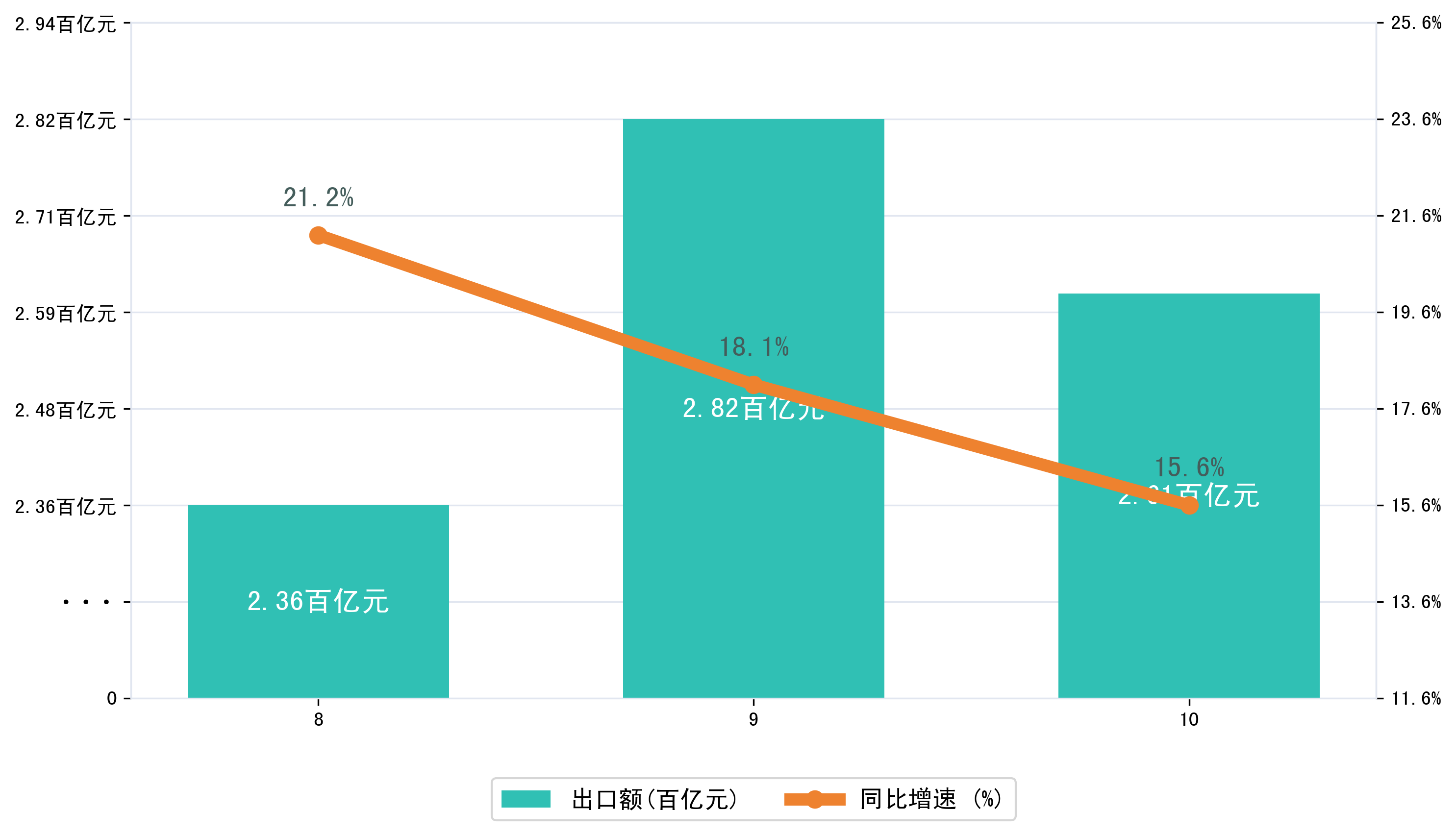 以人民币计,2025年1-10月武汉市出口额为2505,2440.7104万元,相比上年同期增加了340,5656.2724万元,同比增加了15.60%。