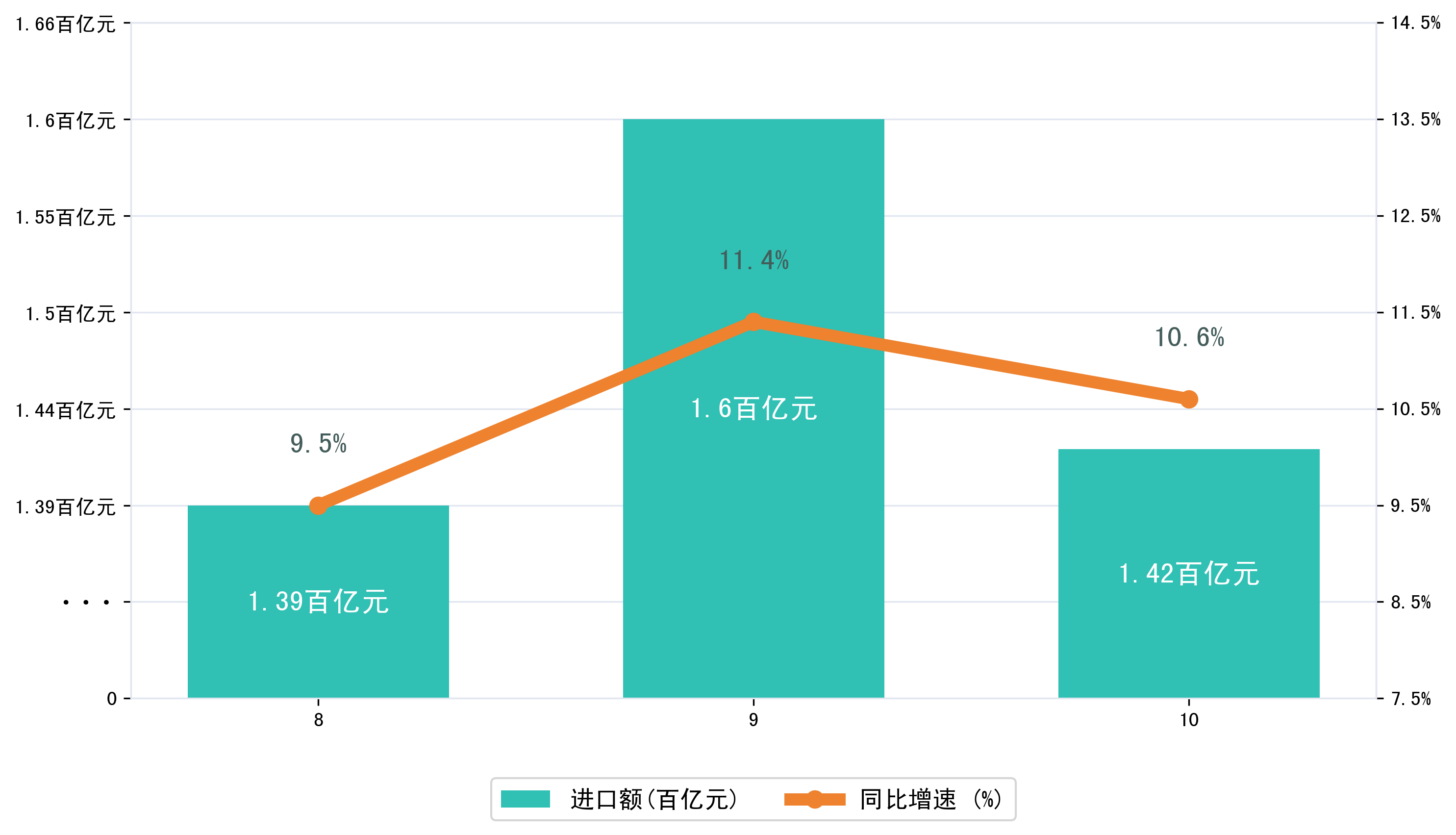 以人民币计,2025年10月武汉市进口额为142,1810.0322万元,相比上月减少了18,1811.8593万元;相比上年同期增加了6,0136.6206万元,同比增加了10.60%。