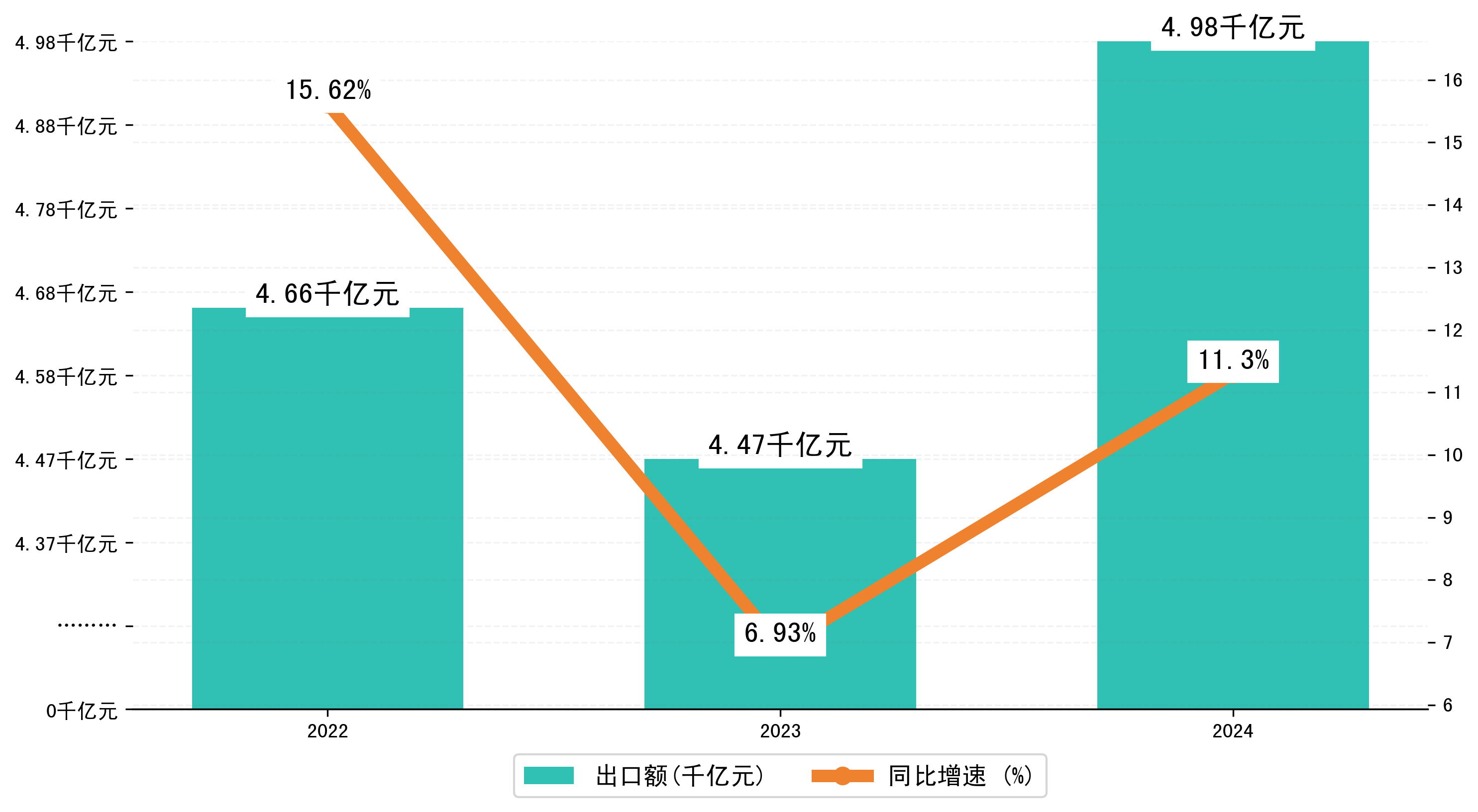 以人民币计,2024年1-12月厦门市出口额为4980,1089.198万元,相比上年同期增加了505,6196.3994万元,同比增加了11.30%。