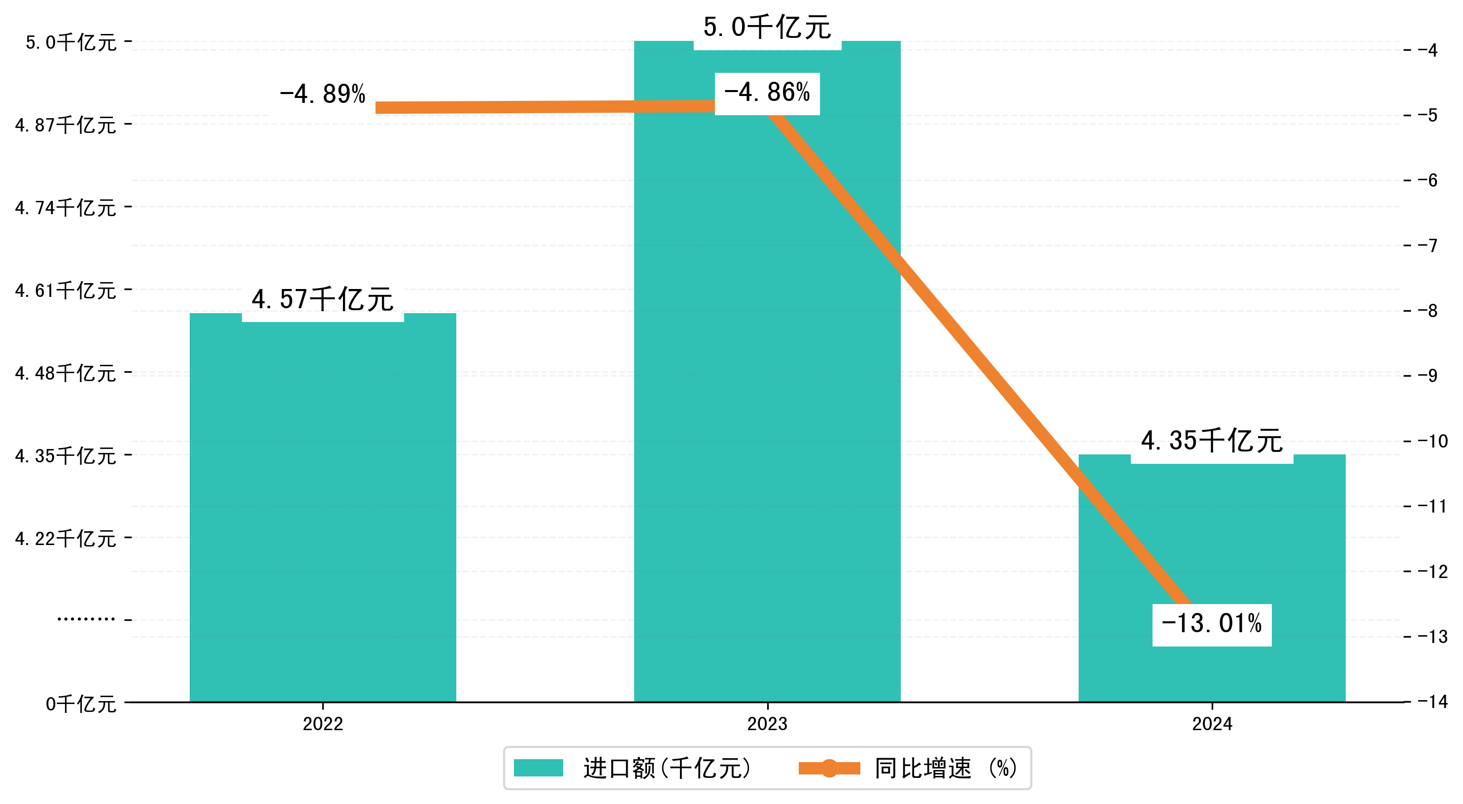 以人民币计,2024年1-12月厦门市进口额为4346,0128.803万元,相比上年同期减少了649,9385.5422万元,同比减少了-13.00%。