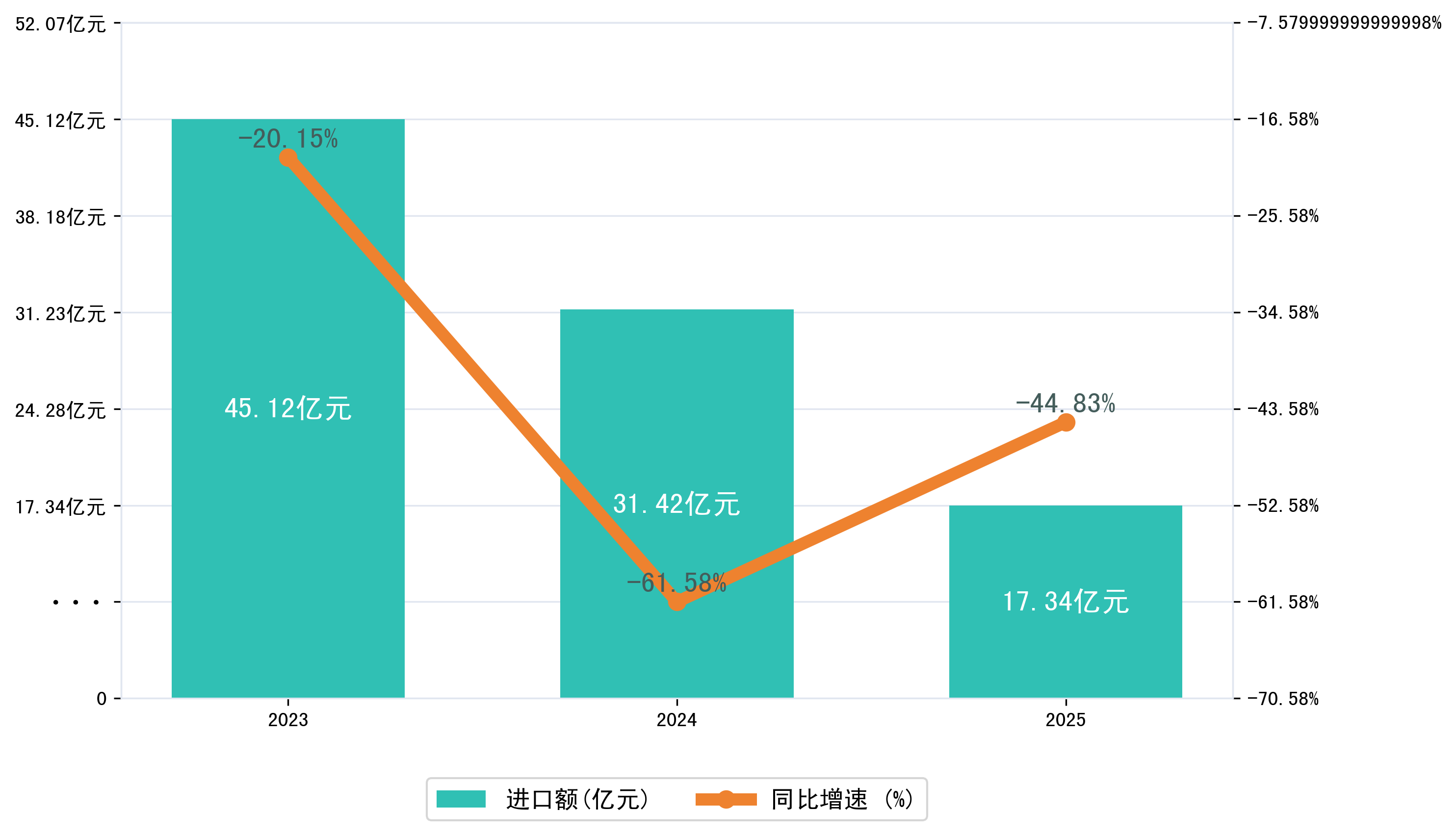 以人民币计,2025年1-10月襄阳市进口额为17,3357.6777万元,相比上年同期减少了14,0841.072万元,同比减少了-44.80%。