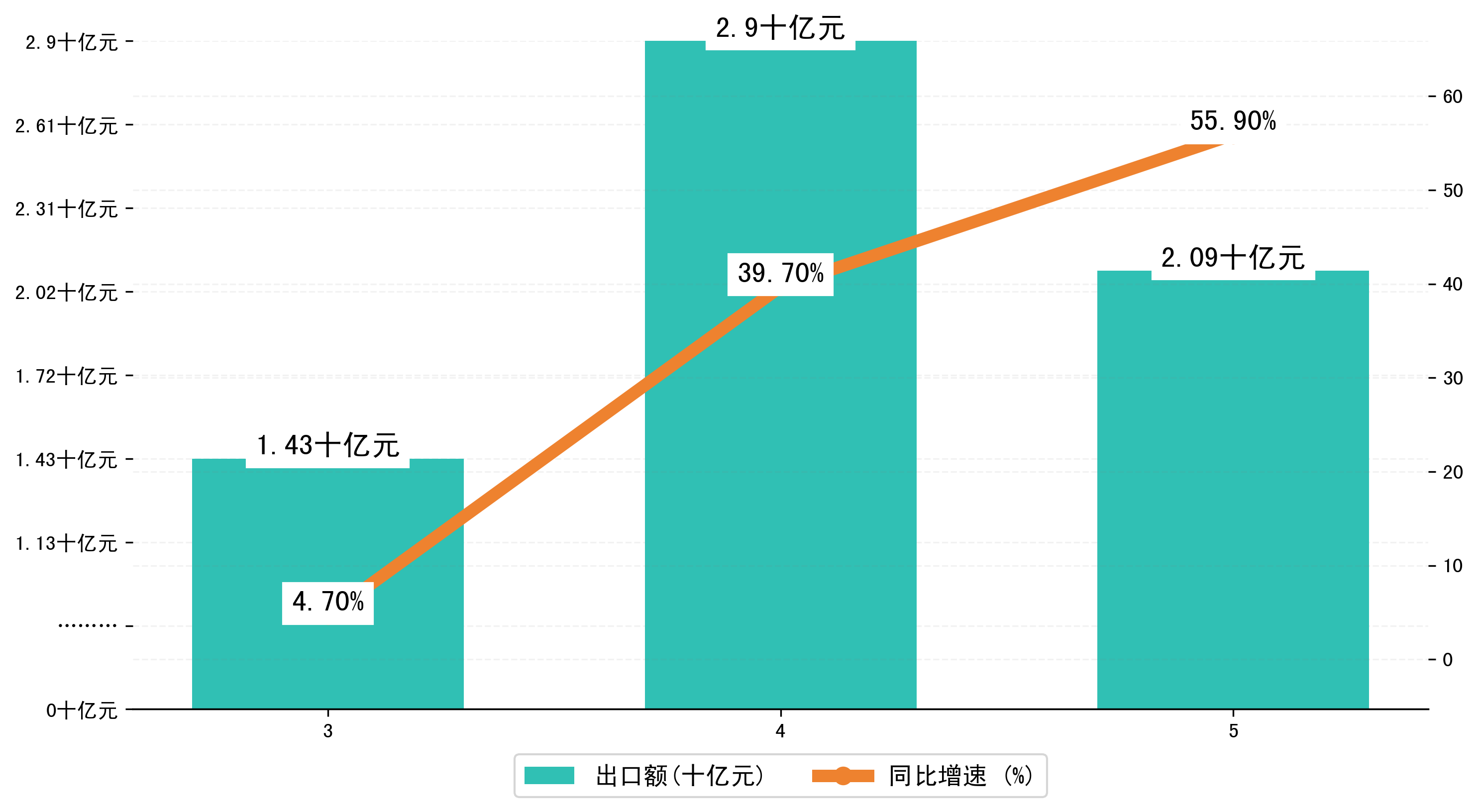 以人民币计,2025年1-5月孝感市出口额为91,3889.6679万元,相比上年同期增加了27,3402.4135万元,同比增加了55.90%。