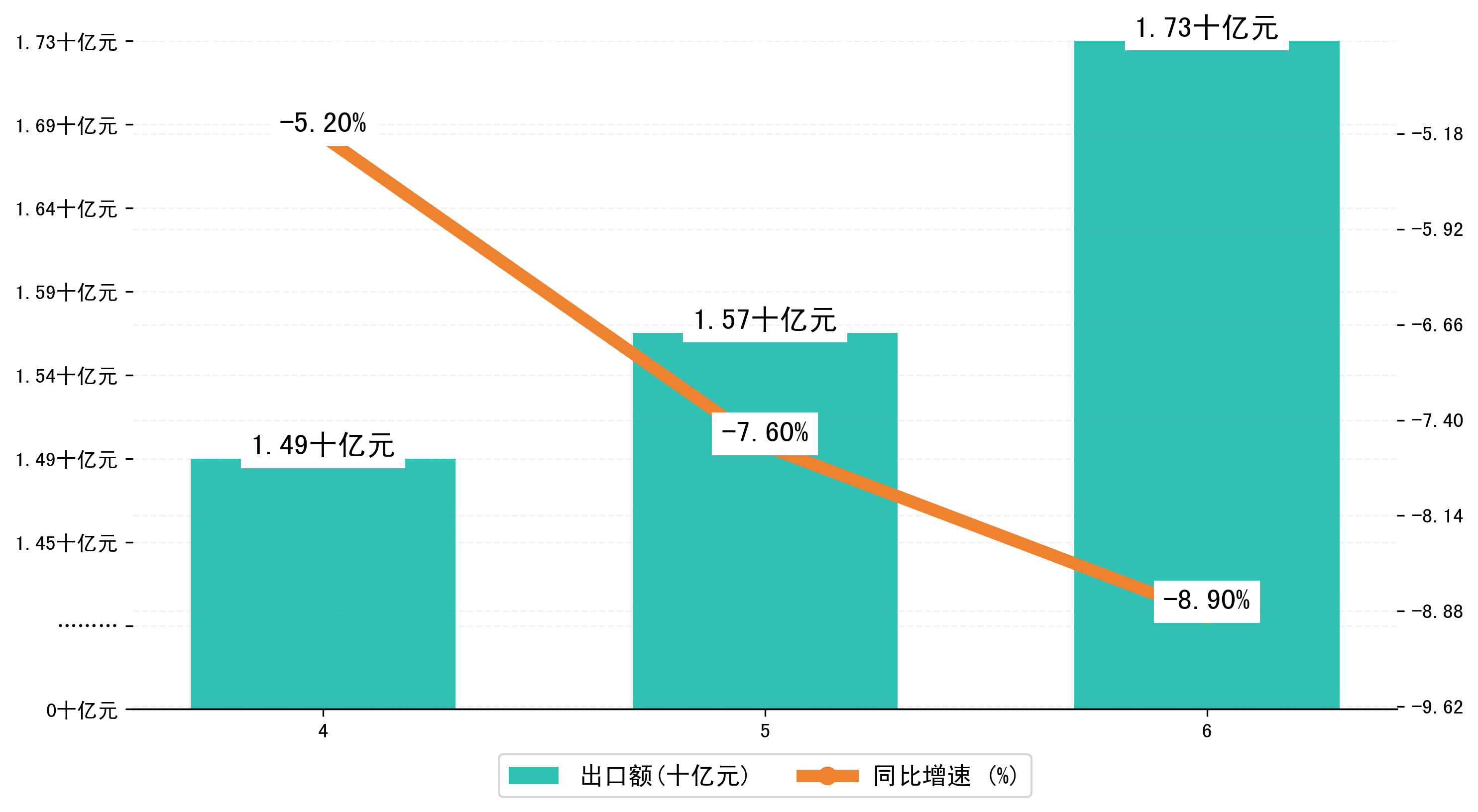 以人民币计,2023年6月宣城市出口额为17,3342.4445万元,相比上月增加了1,6795.5205万元;相比上年同期减少了2,9175.2547万元,同比减少了-8.90%。