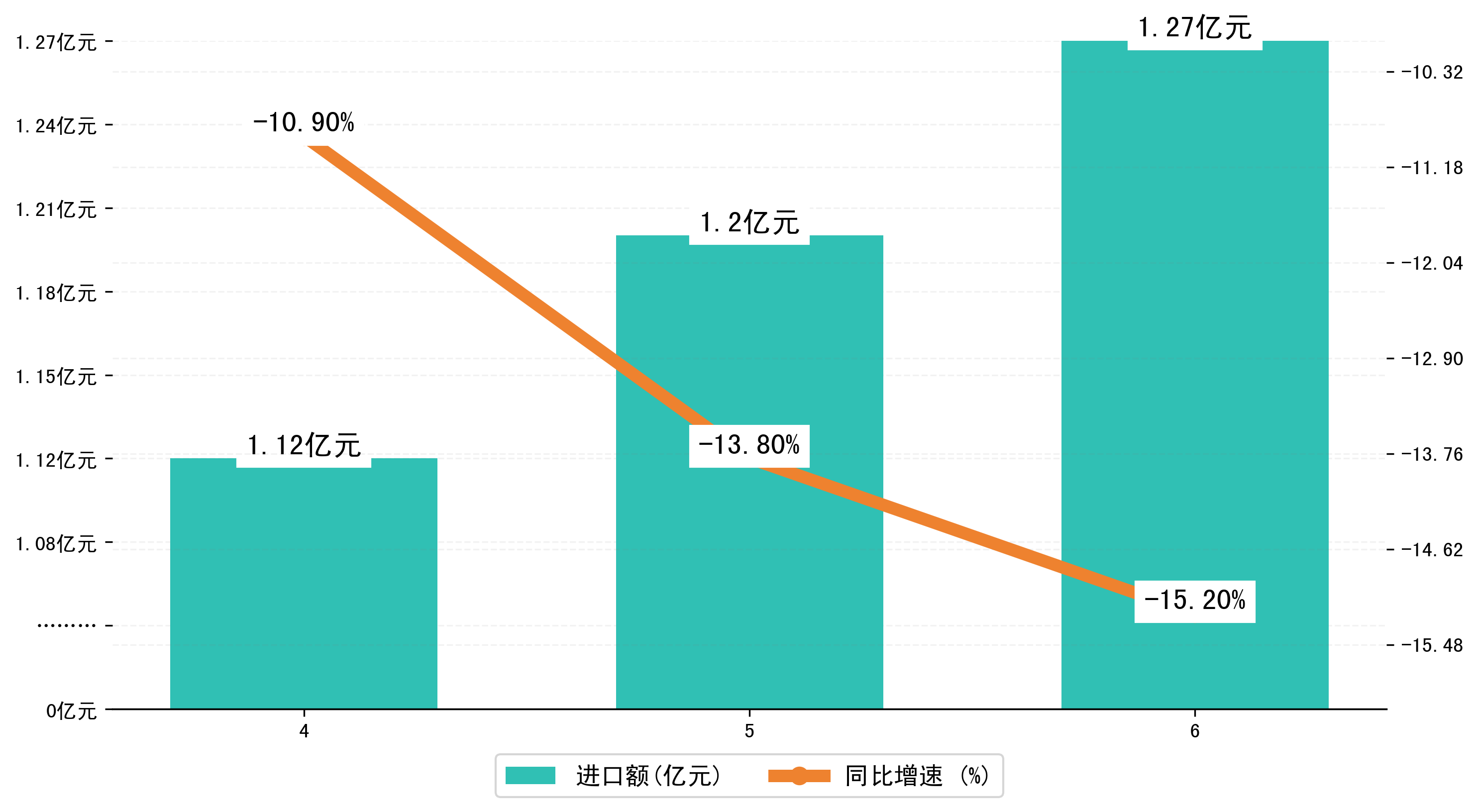 以人民币计,2023年6月宣城市进口额为1,2742.741万元,相比上月增加了739.2022万元;相比上年同期减少了3422.2885万元,同比减少了-15.20%。