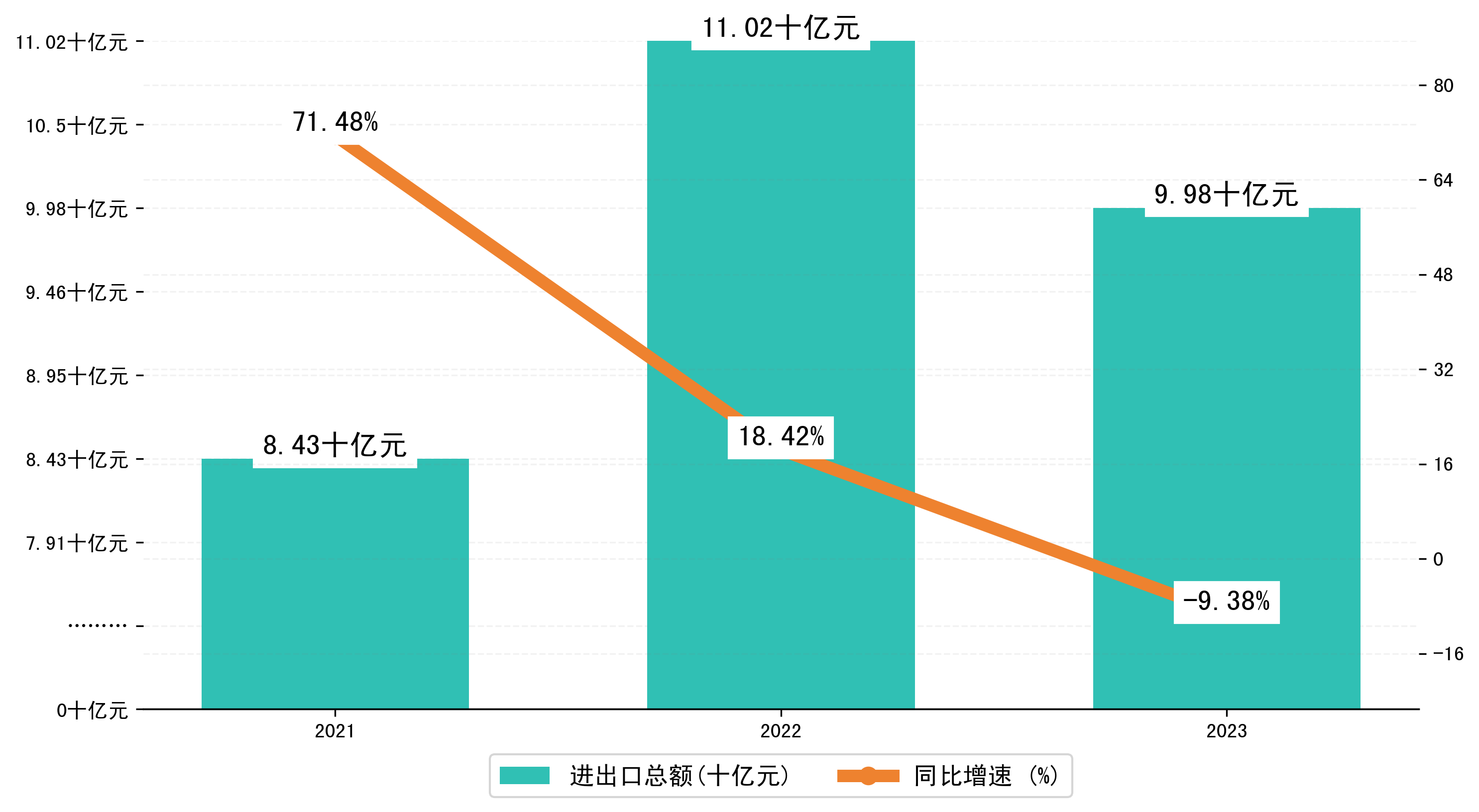 以人民币计,2023年1-6月宣城市进出口总额为99,8272.3809万元,相比上年同期减少了10,3363.9769万元,同比减少了-9.40%。