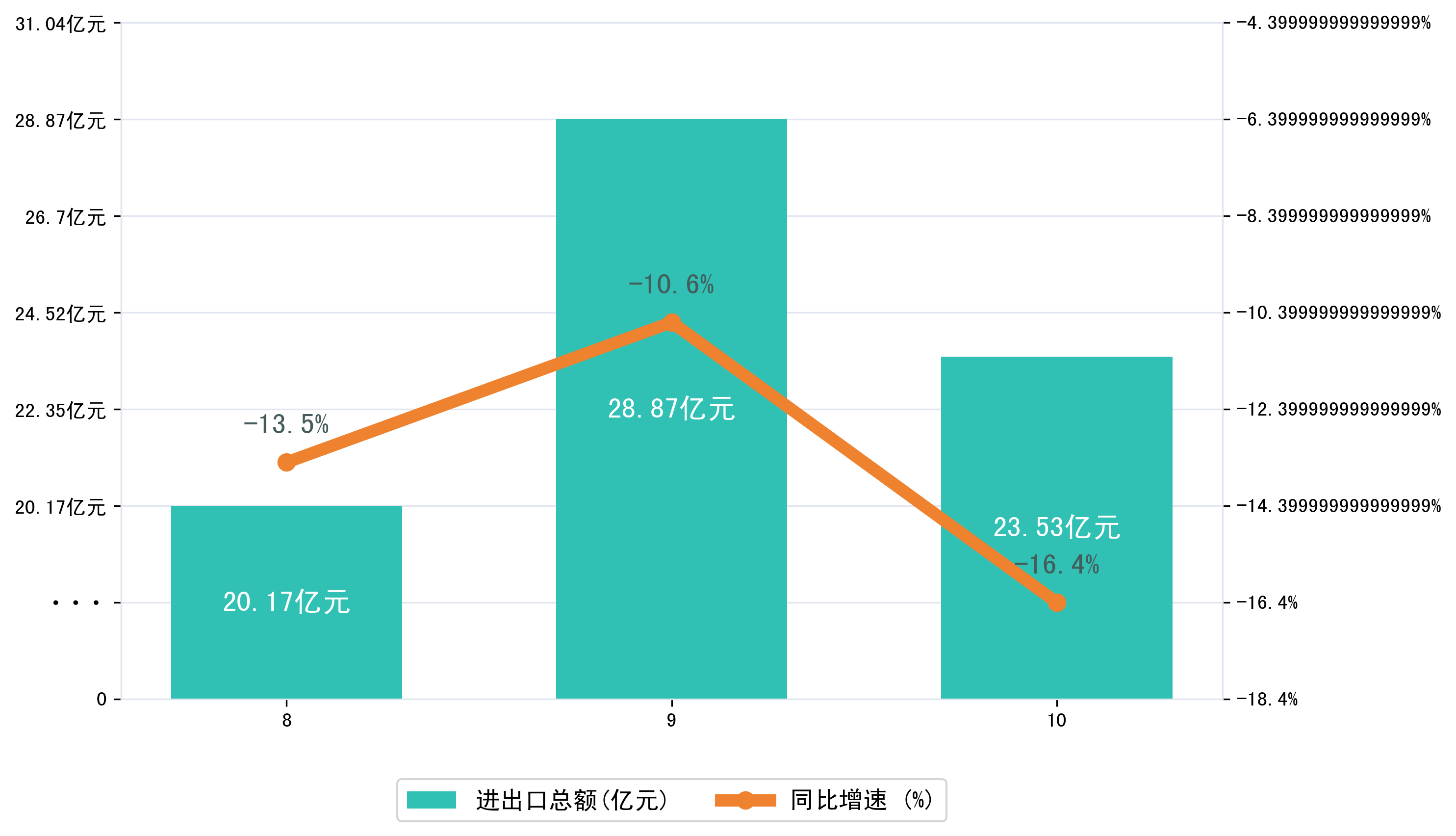 以人民币计,2025年10月宜宾市进出口总额为23,5281.4484万元,相比上月减少了5,3405.505万元;相比上年同期减少了21,5272.415万元,同比减少了-16.40%。