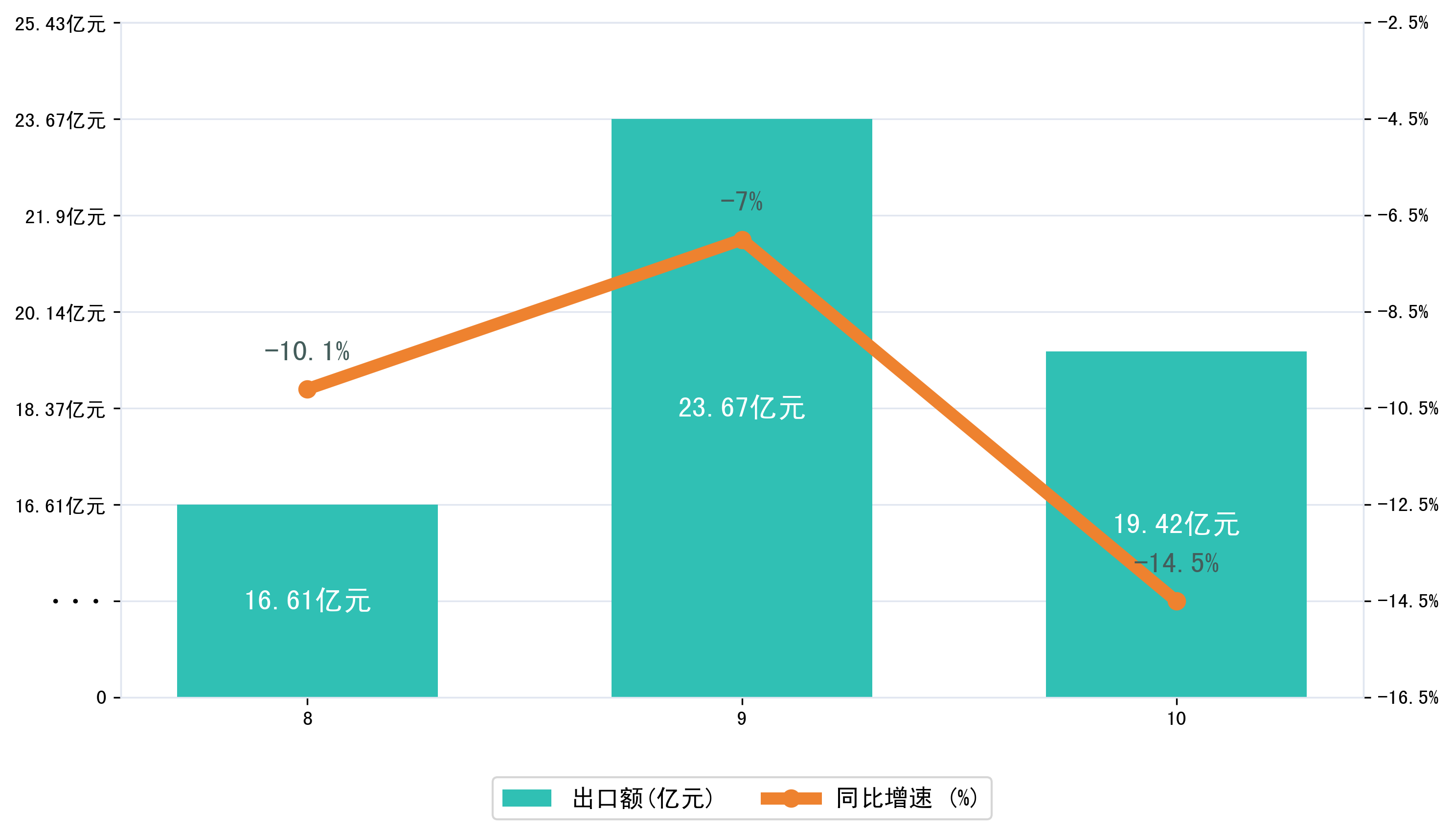 以美元计,2025年10月宜宾市出口额为2,7319.9982万美元,相比上月减少了5938.3612万美元;相比上年同期减少了2,7178.5808万美元,同比减少-15.20%。