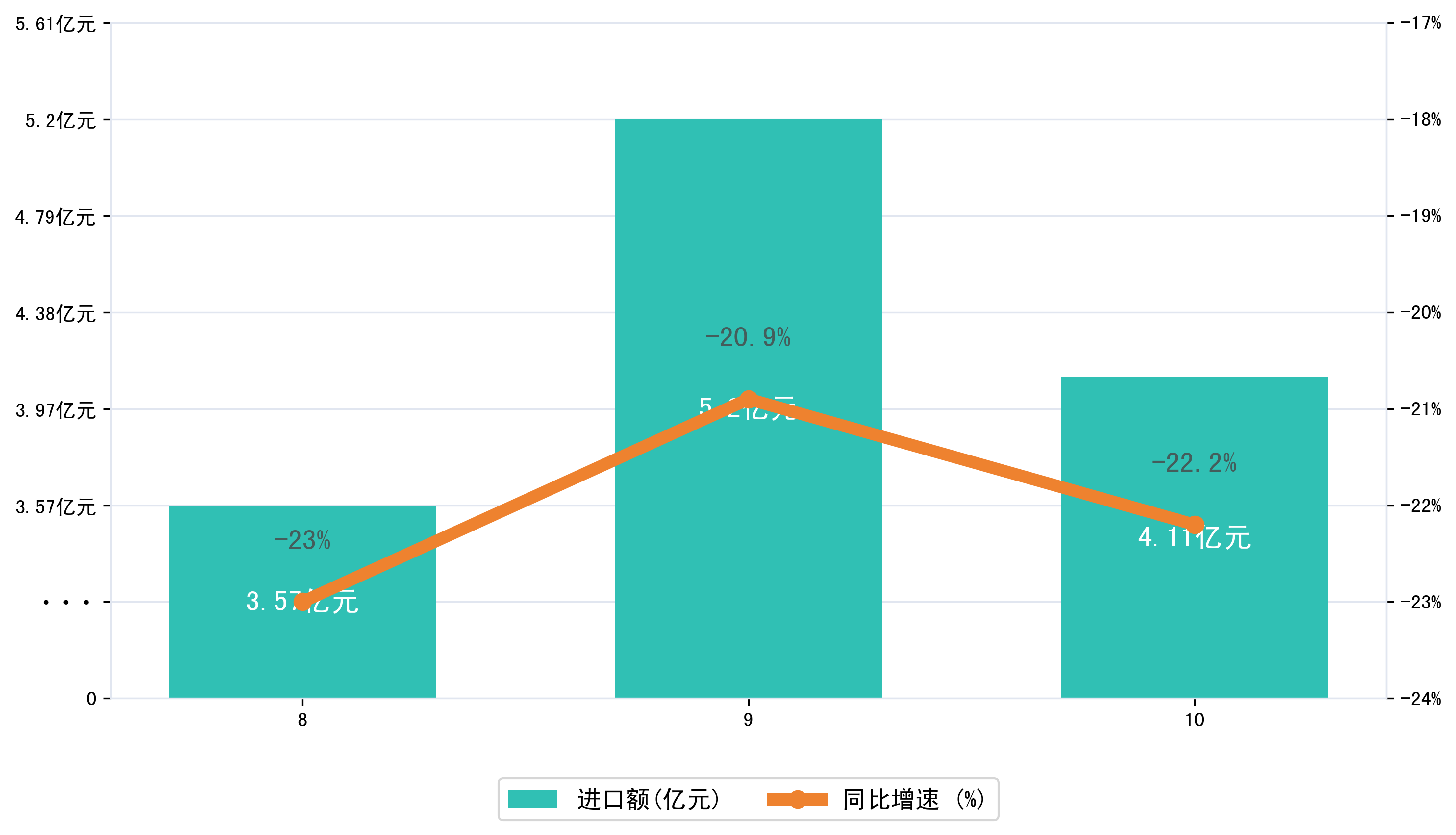 以美元计,2025年10月宜宾市进口额为5781.3778万美元,相比上月减少了1508.1889万美元;相比上年同期减少了3424.9624万美元,同比减少-23.00%。