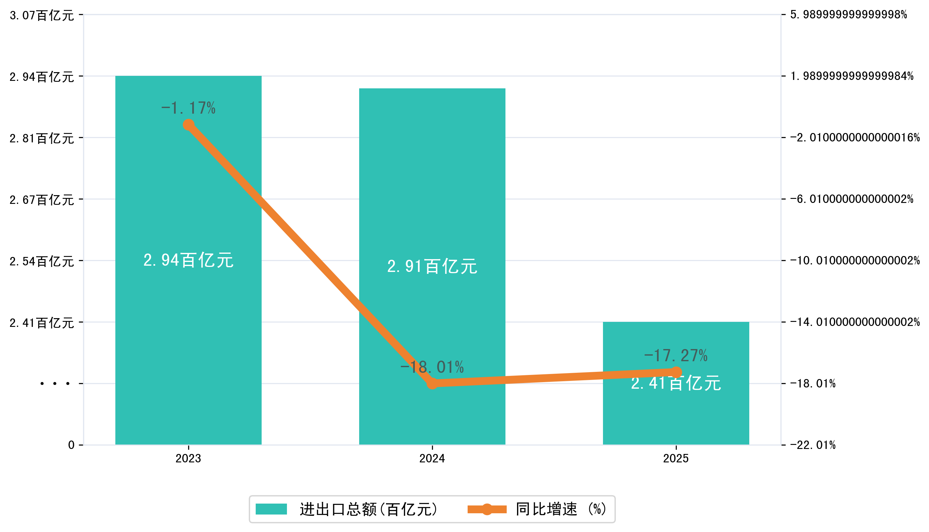 以人民币计,2025年1-10月宜宾市进出口总额为240,9152.1149万元,相比上年同期减少了50,2817.8514万元,同比减少了-16.40%。