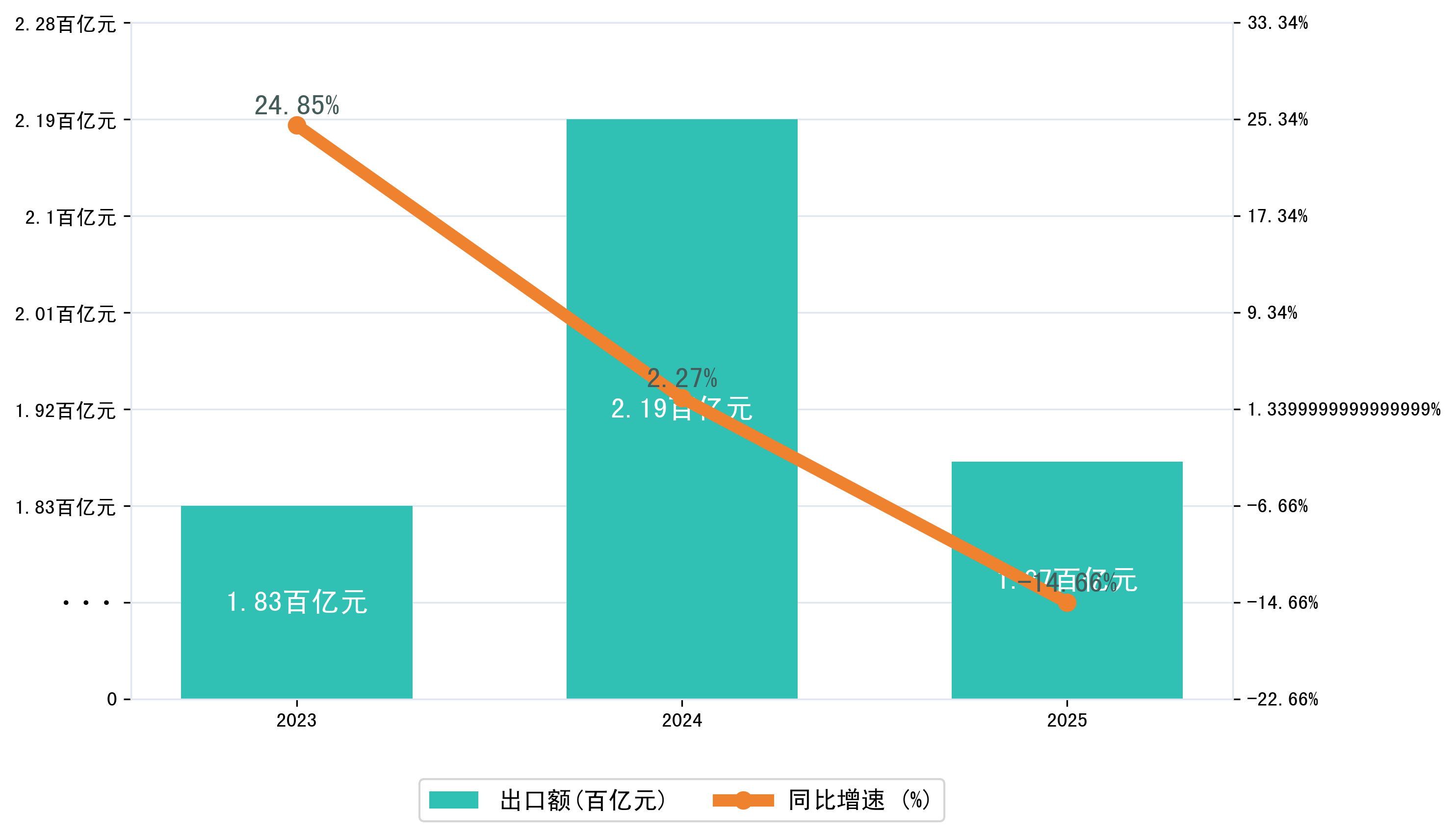 以人民币计,2025年1-10月宜宾市出口额为186,8968.4101万元,相比上年同期减少了32,1132.2344万元,同比减少了-14.50%。