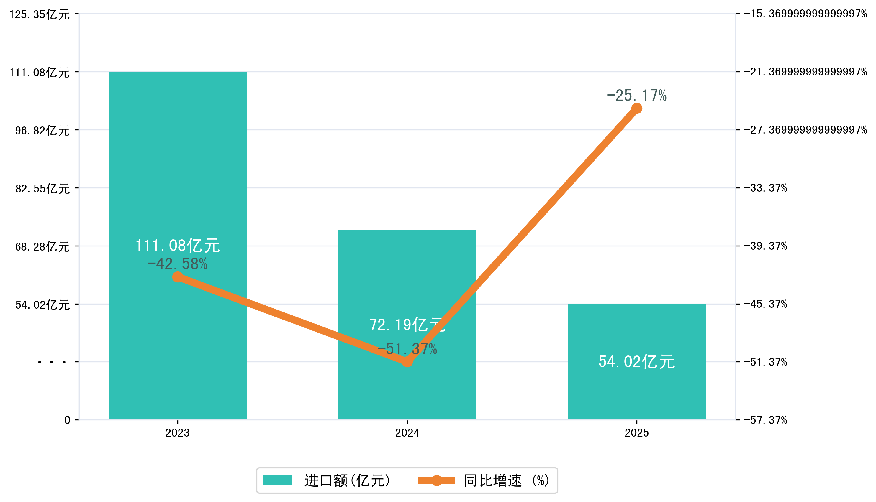 以人民币计,2025年1-10月宜宾市进口额为54,0183.7047万元,相比上年同期减少了18,1685.6171万元,同比减少了-22.20%。