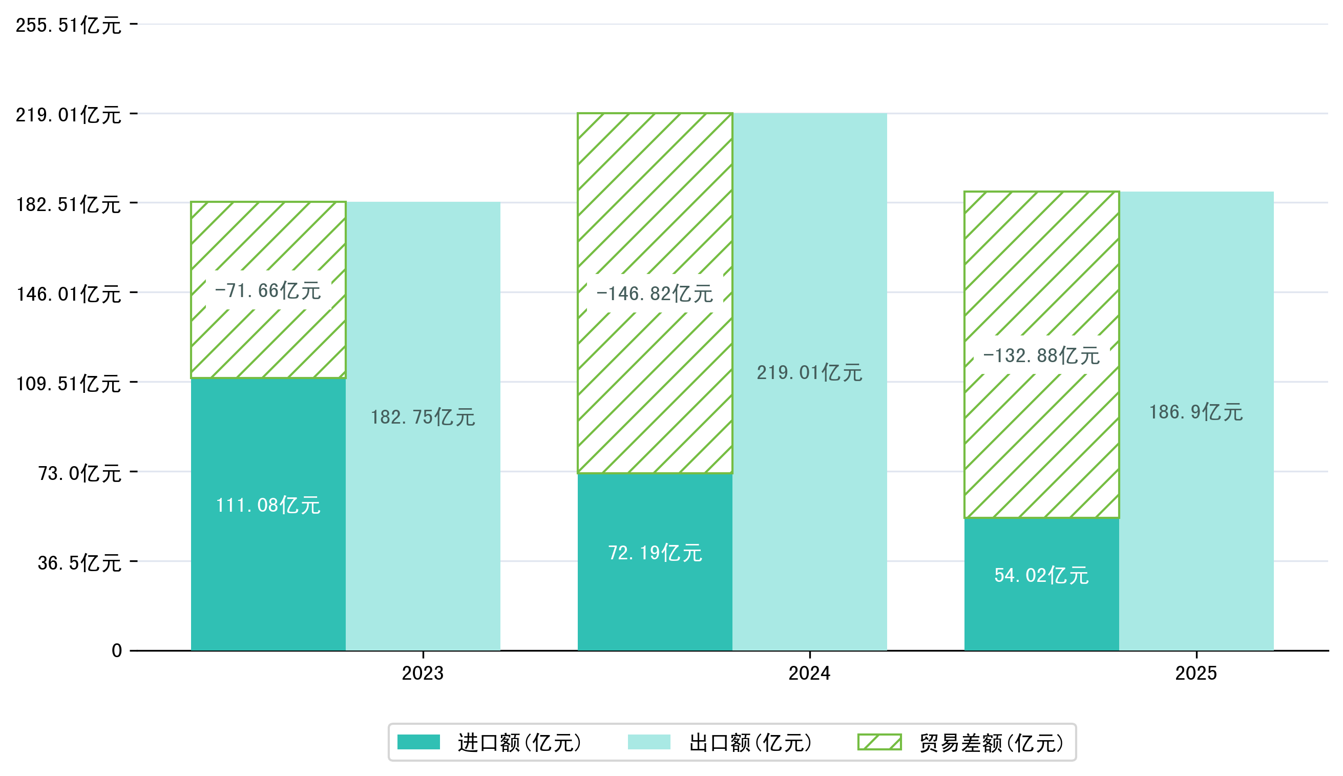 以美元计,2025年1-10月宜宾市贸易差额为18,5623,7947万美元(贸易顺差),相比上年同期减少了2,1168,9096万美元,同比减少-10.24%。