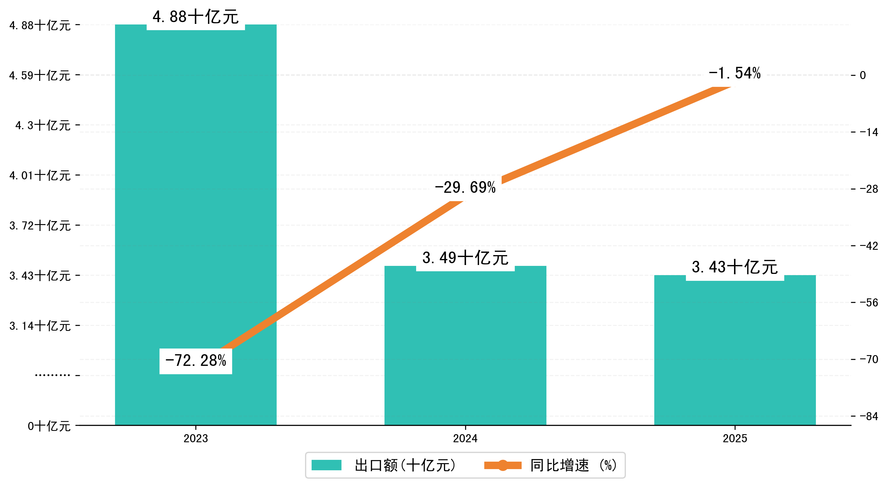以美元计,2025年1-8月益阳市出口额为4,7832.1125万美元,相比上年同期减少了1243.5114万美元,同比减少-2.50%。
