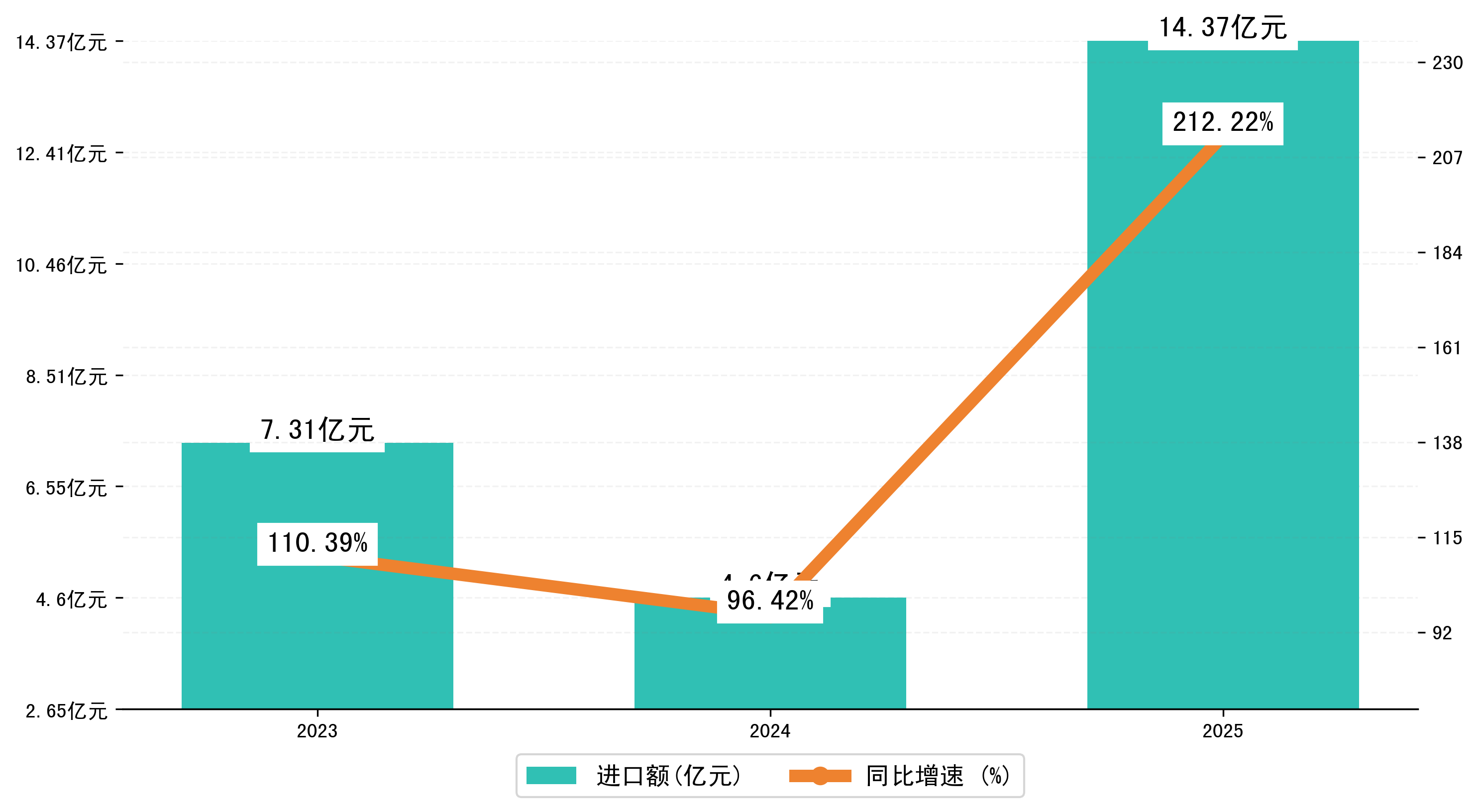 以人民币计,2025年1-8月益阳市进口额为14,3677.257万元,相比上年同期增加了9,7659.9004万元,同比增加了212.20%。