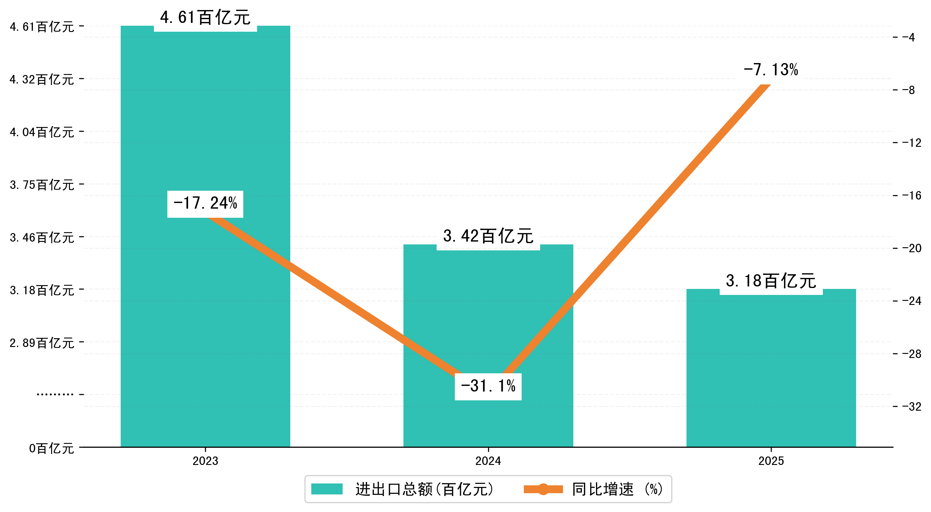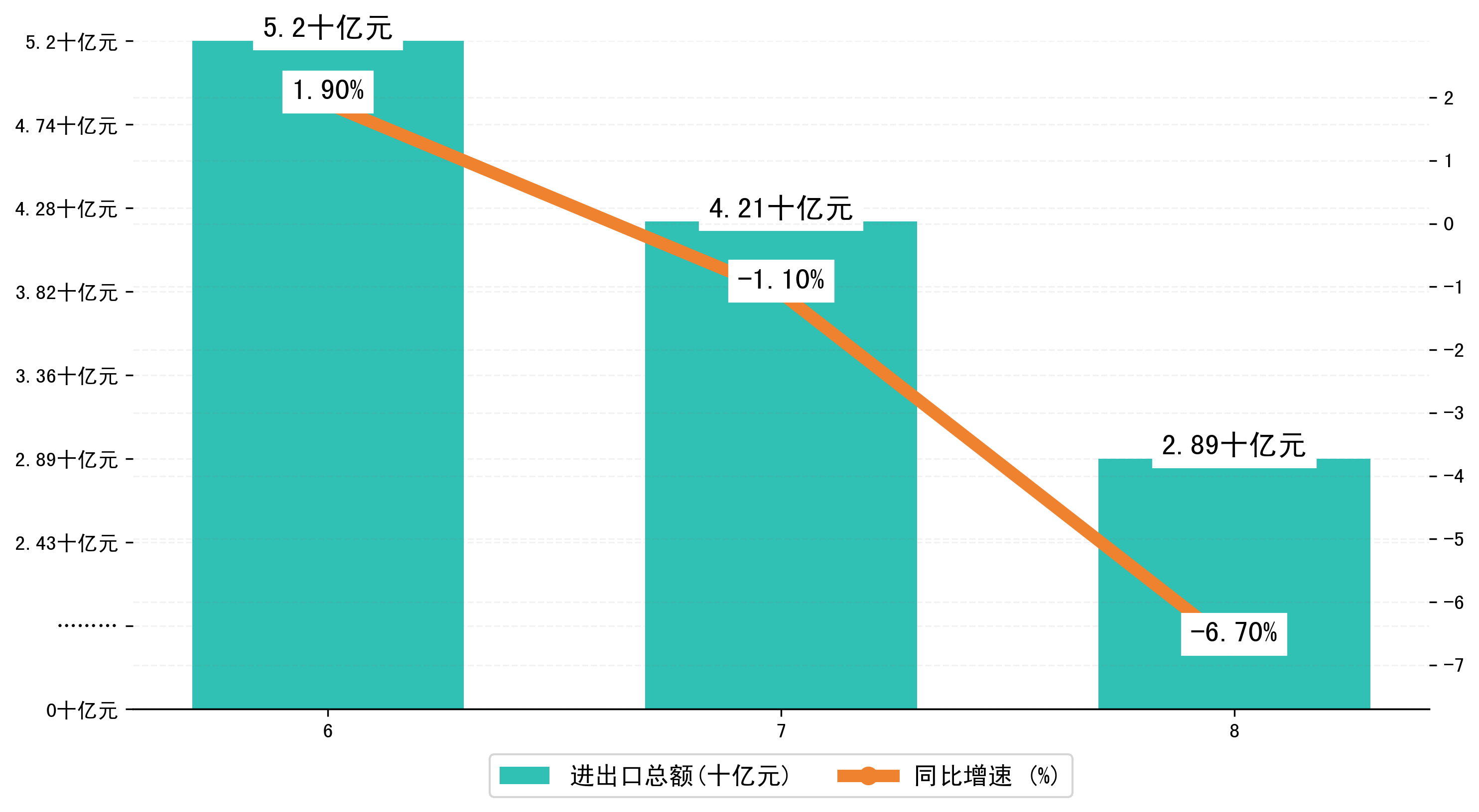 以人民币计,2025年1-8月岳阳市进出口总额为317,5968.8553万元,相比上年同期减少了24,3655.6966万元,同比减少了-6.70%。