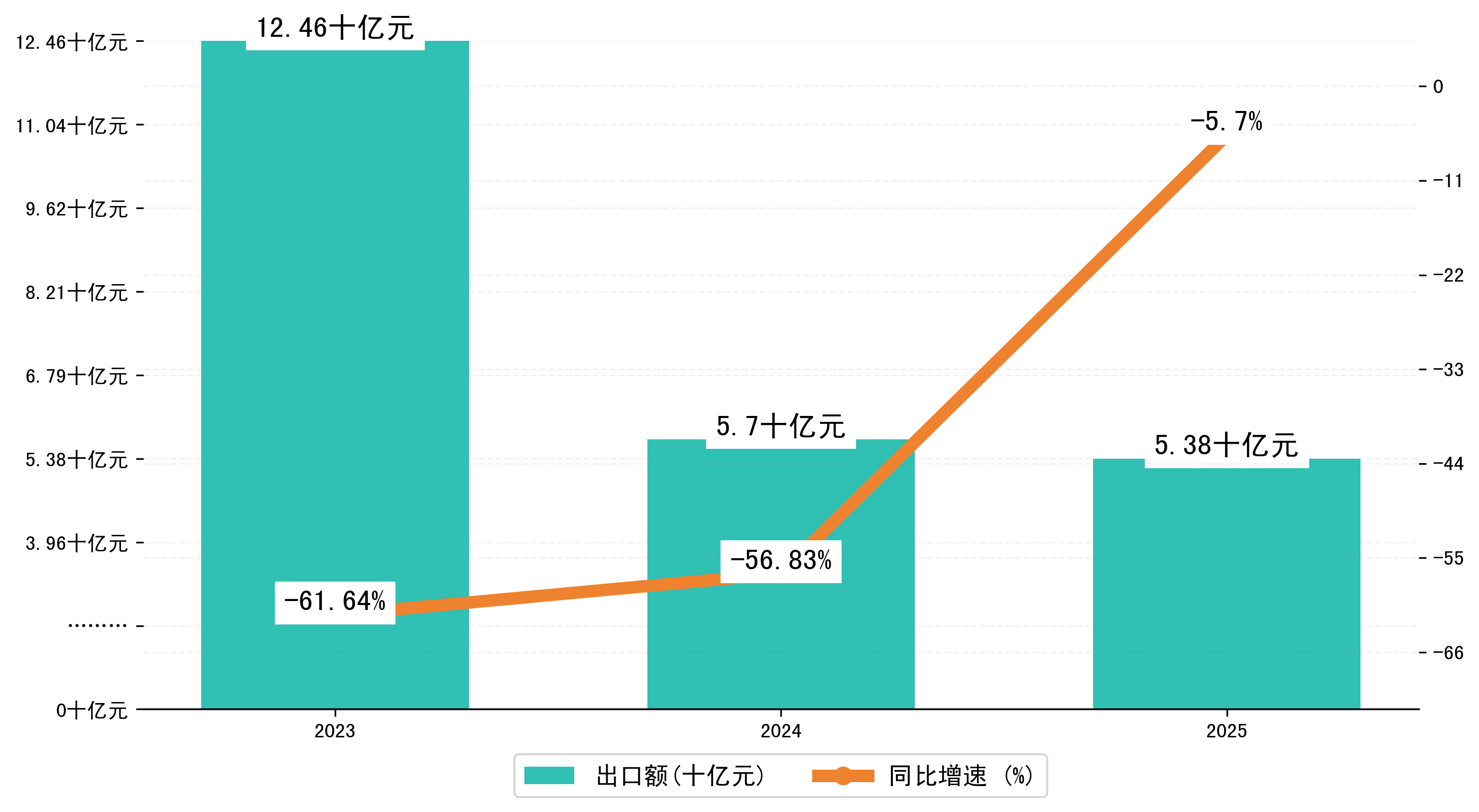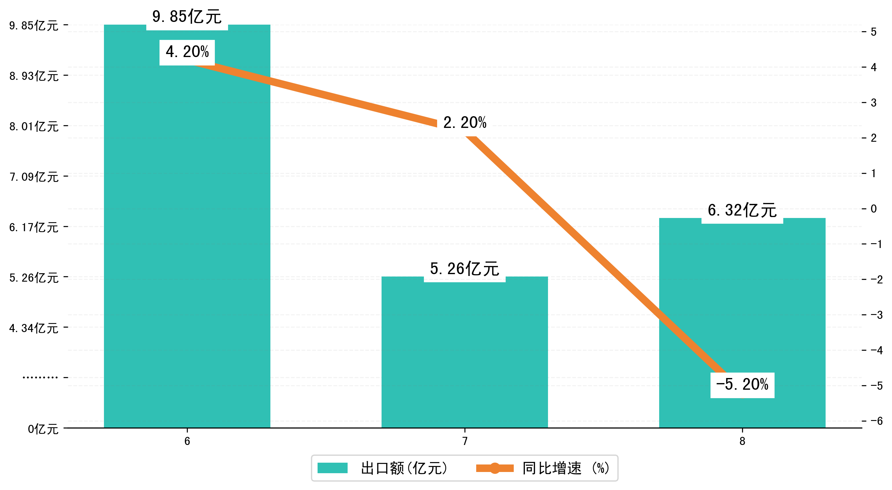 以美元计,2025年1-8月岳阳市出口额为7,4869.4636万美元,相比上年同期减少了5293.5645万美元,同比减少-6.10%。