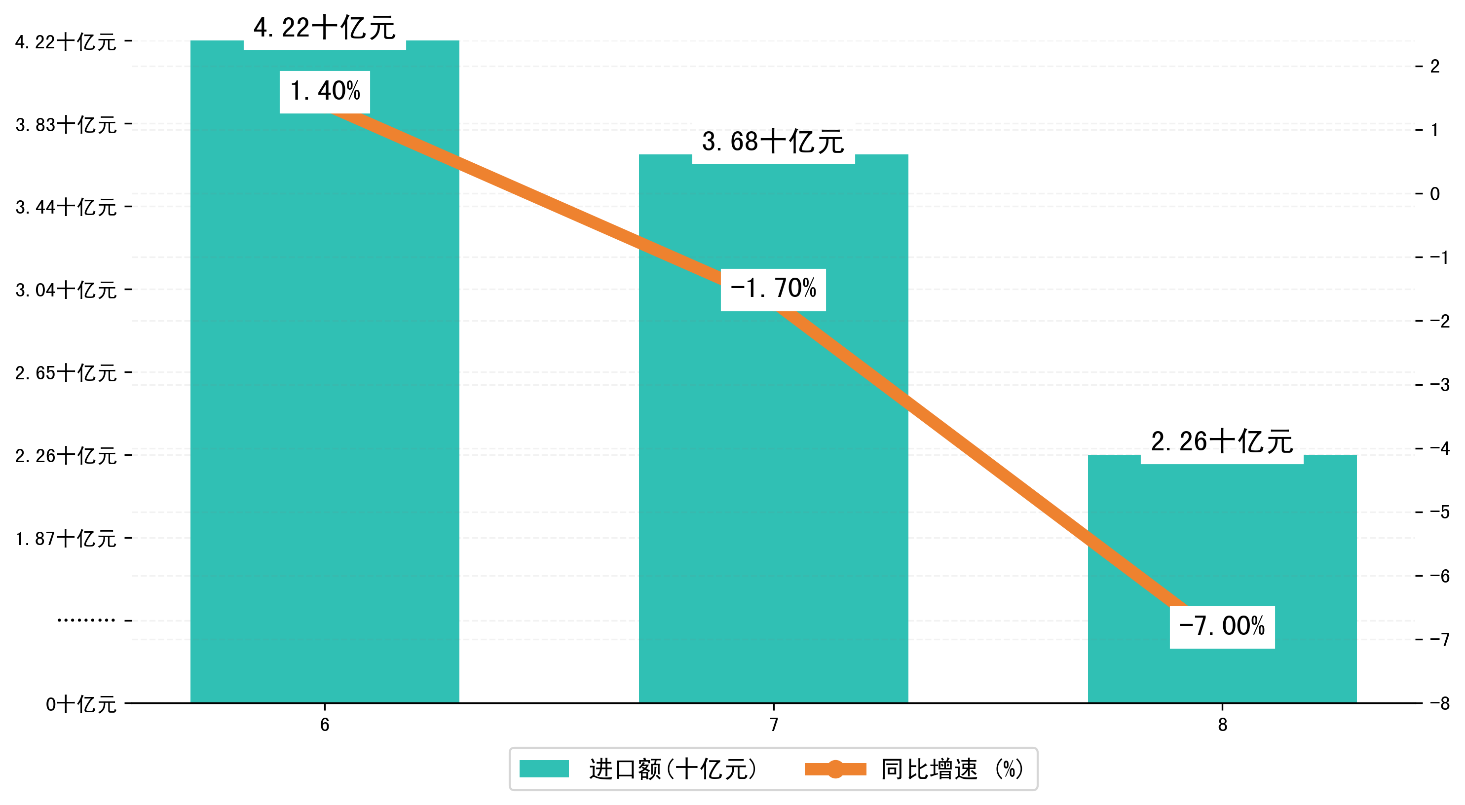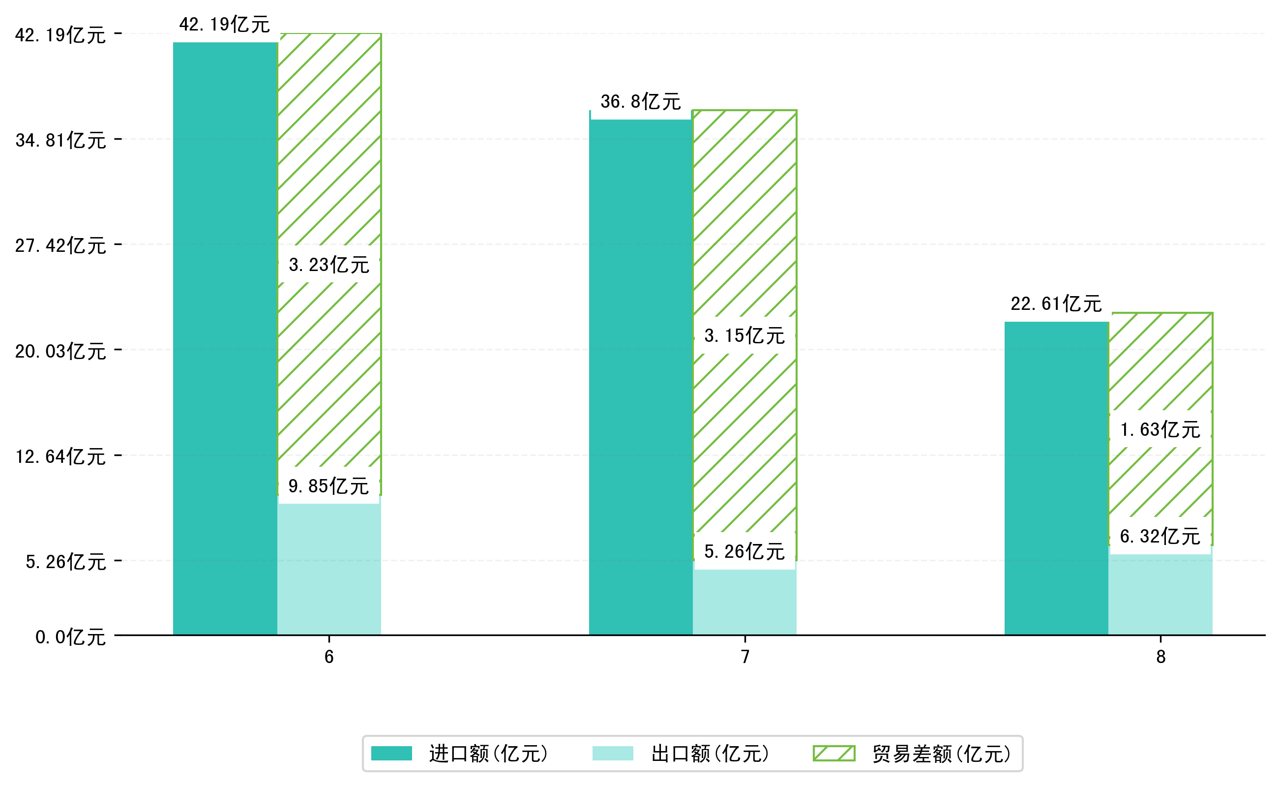 以美元计,2025年1-8月岳阳市进口额为36,7339.7005万美元,相比上年同期减少了3,3403.2306万美元,同比减少-7.90%。