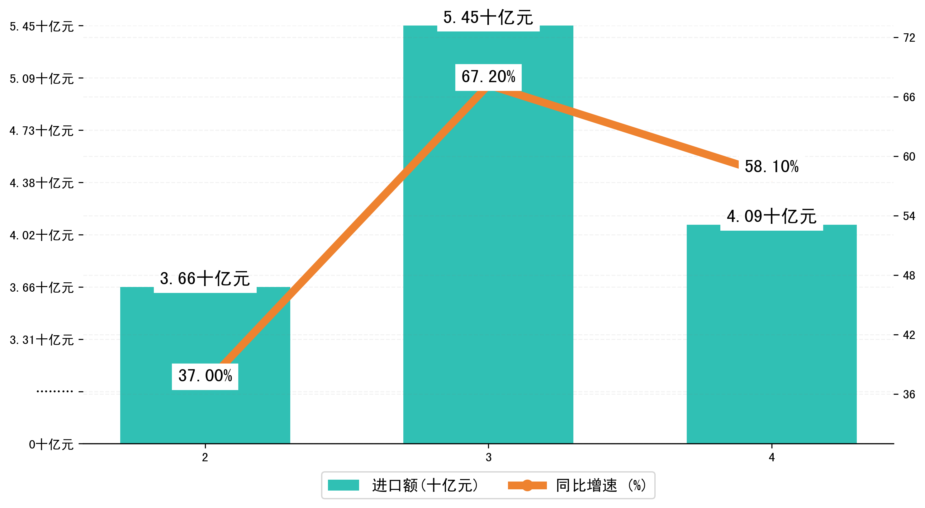 以美元计,2023年1-4月岳阳市进口额为23,7528.1448万美元,相比上年同期增加了7,5193.3223万美元,同比增加46.50%。