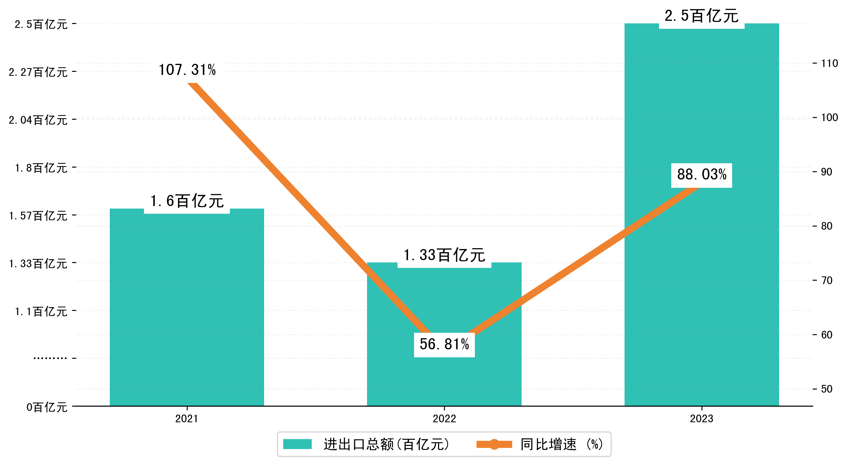 以人民币计,2023年1-4月岳阳市进出口总额为250,4380.4345万元,相比上年同期增加了117,2461.3885万元,同比增加了88.20%。