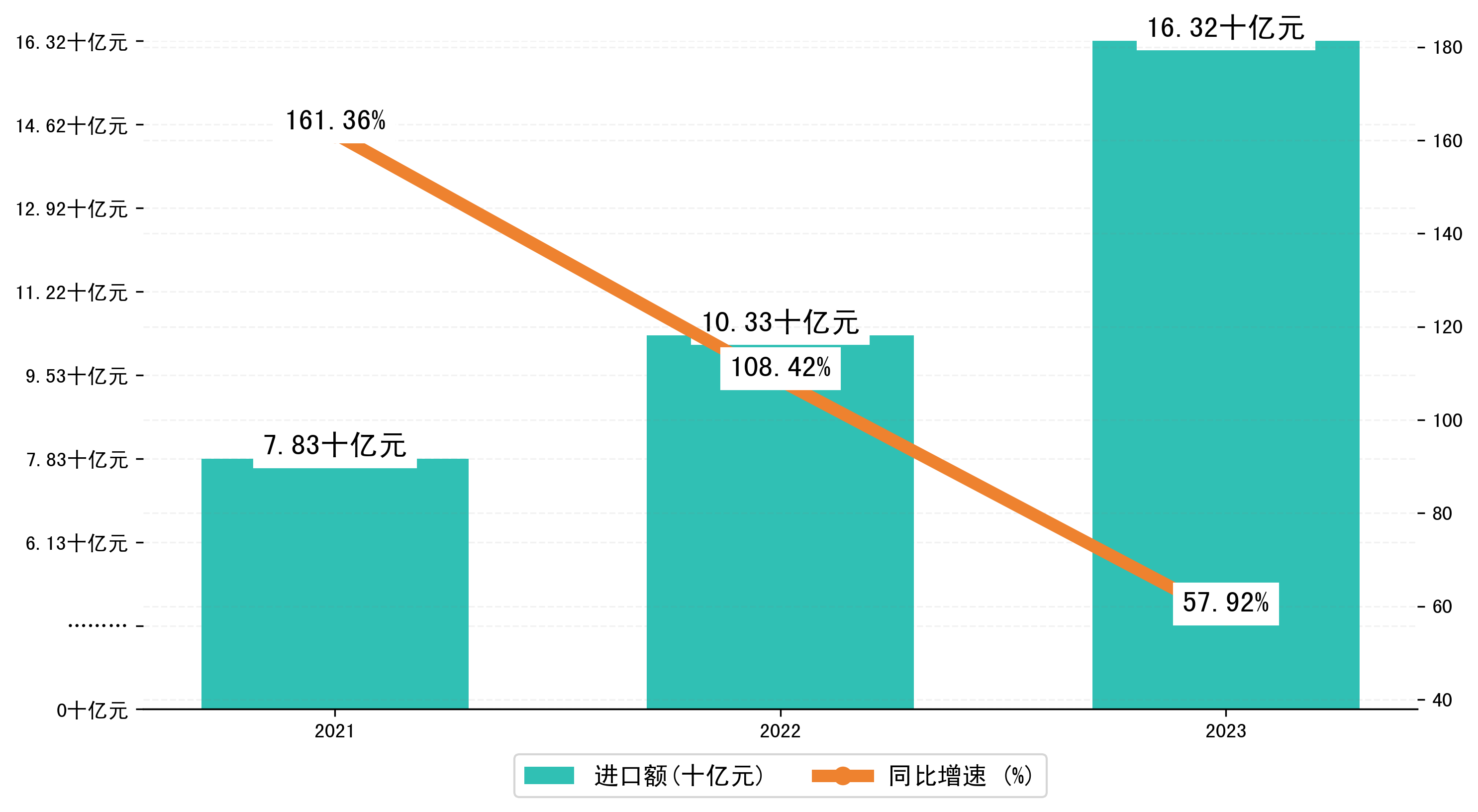 以人民币计,2023年1-4月岳阳市进口额为163,1619.6483万元,相比上年同期增加了59,8452.2524万元,同比增加了58.10%。