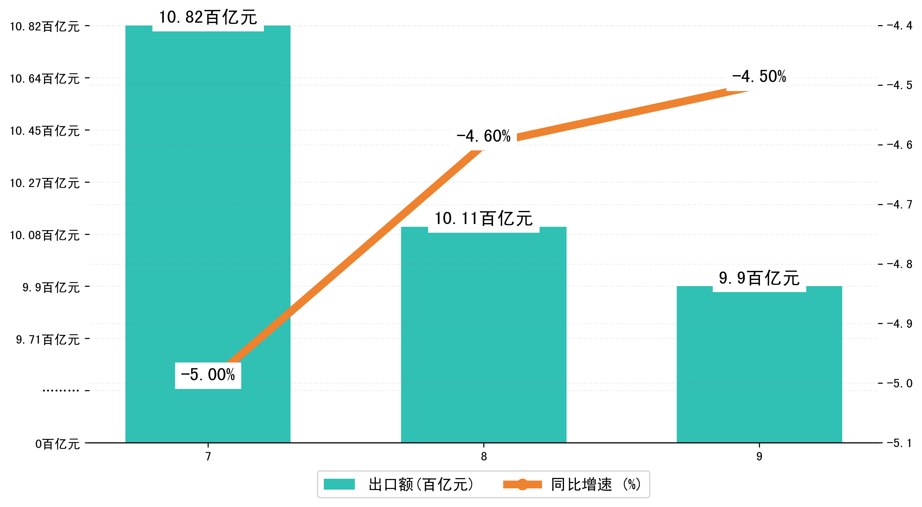 以人民币计,2025年9月福建省出口额为989,5393.682万元,相比上月减少了21,2286.2141万元;相比上年同期减少了40,7416.6937万元,同比减少了-4.50%。