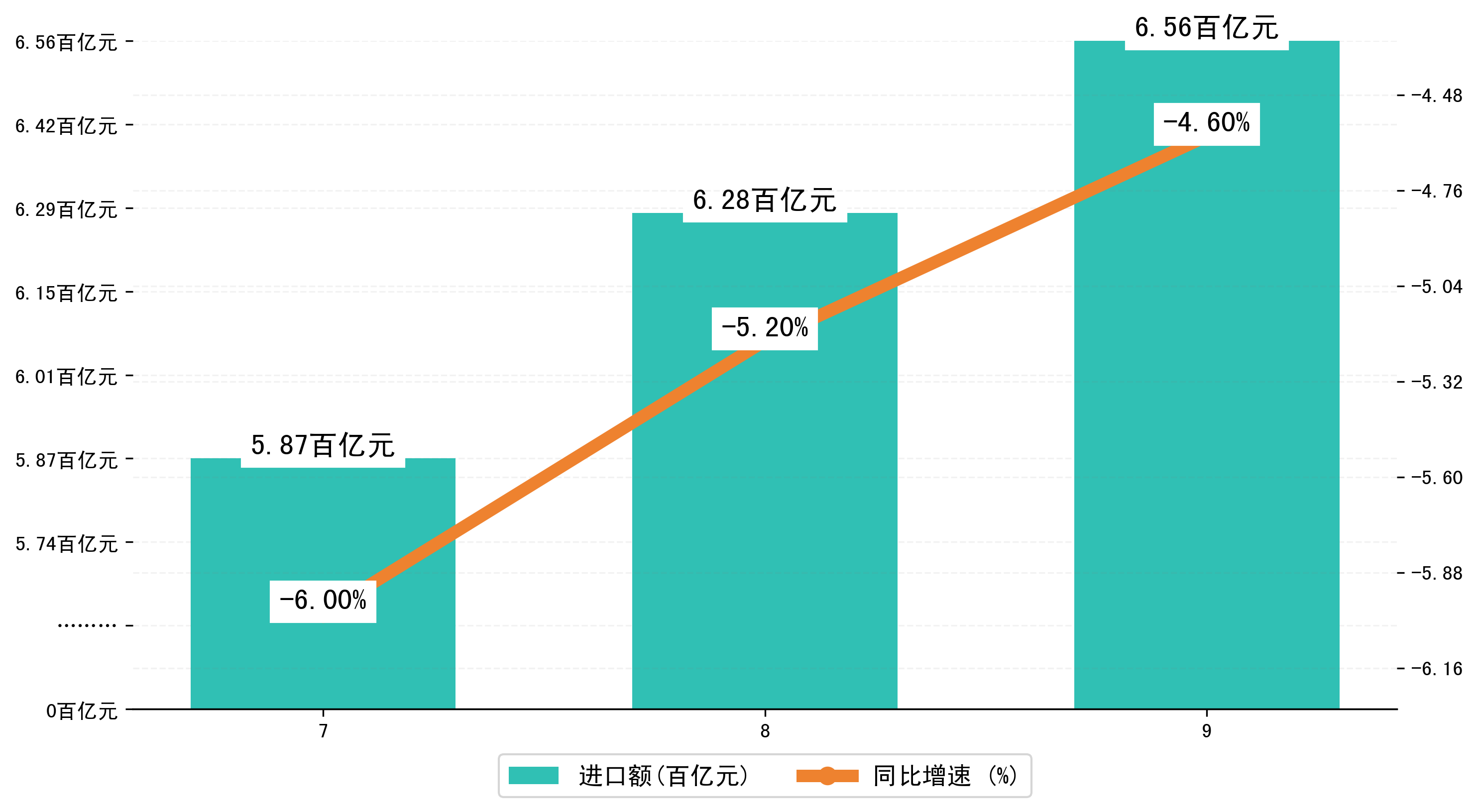 以人民币计,2025年9月福建省进口额为656,0632.3299万元,相比上月增加了28,3426.7783万元;相比上年同期增加了6199.3389万元,同比减少了-4.60%。