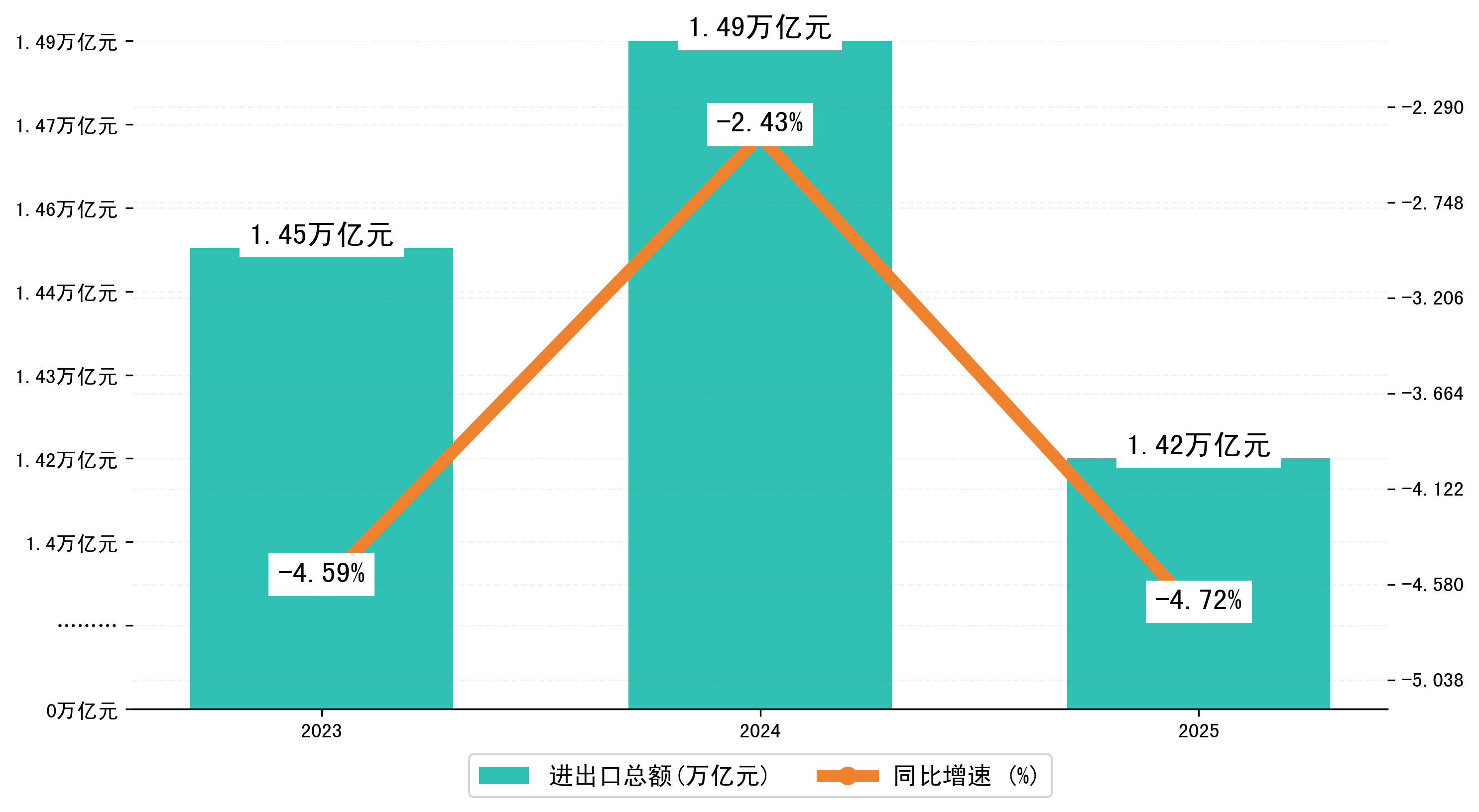 以人民币计,2025年1-9月福建省进出口总额为1,4151,5933.1681万元,相比上年同期减少了700,7055.5007万元,同比减少了-4.60%。