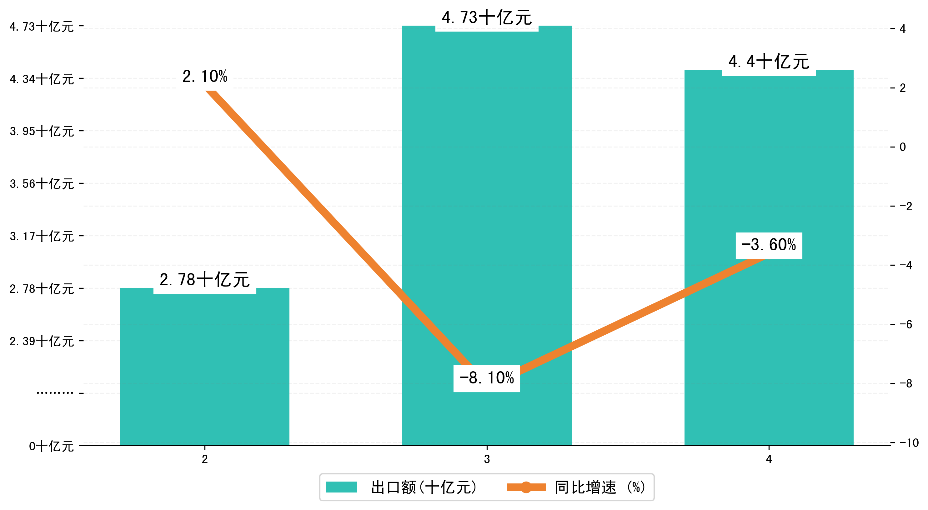 以美元计,2025年1-4月贵州省出口额为21,6876.6676万美元,相比上年同期减少了1,0017.017万美元,同比减少-4.40%。
