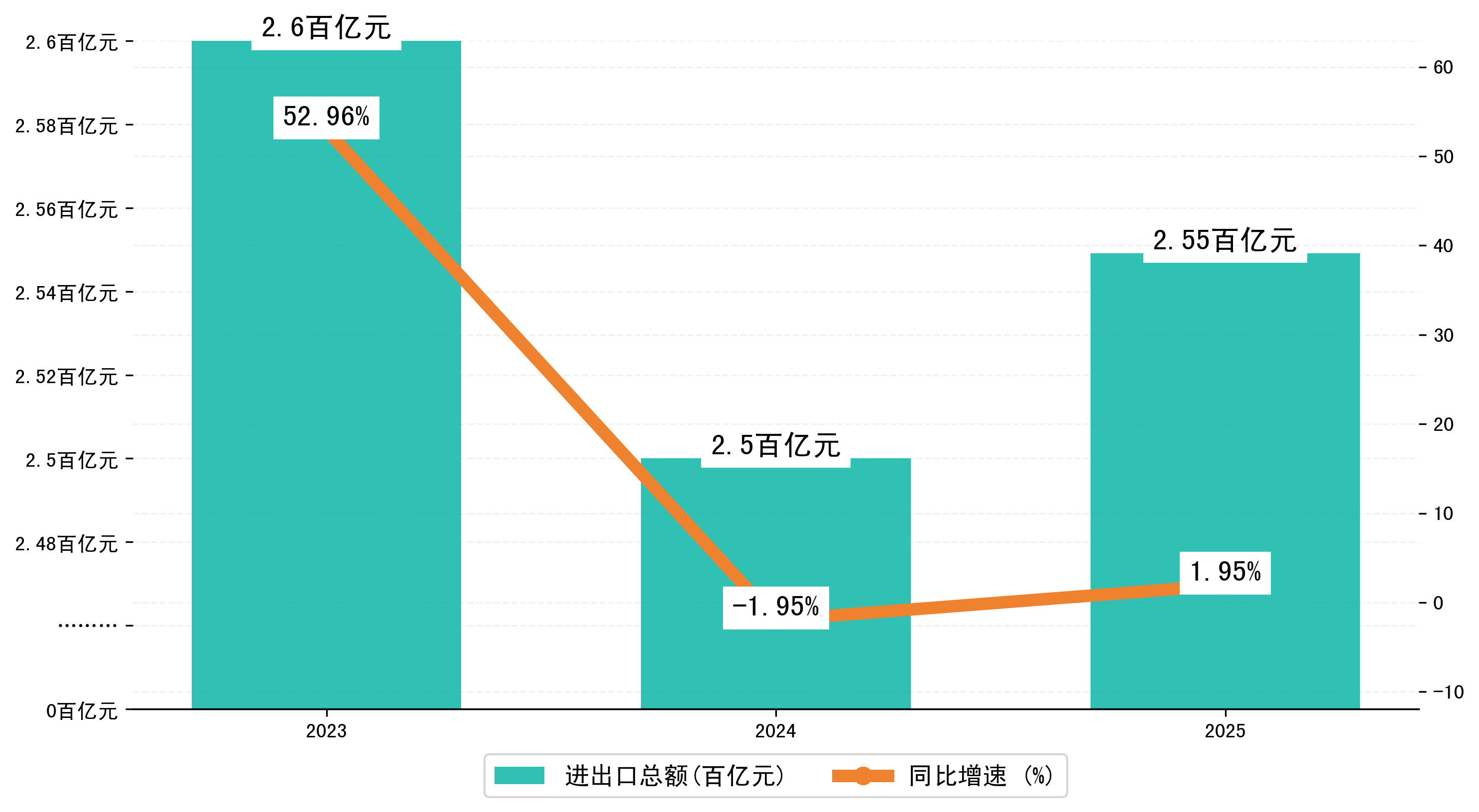 以人民币计,2025年1-4月贵州省进出口总额为254,5328.2043万元,相比上年同期增加了4,8740.9658万元,同比增加了2.10%。