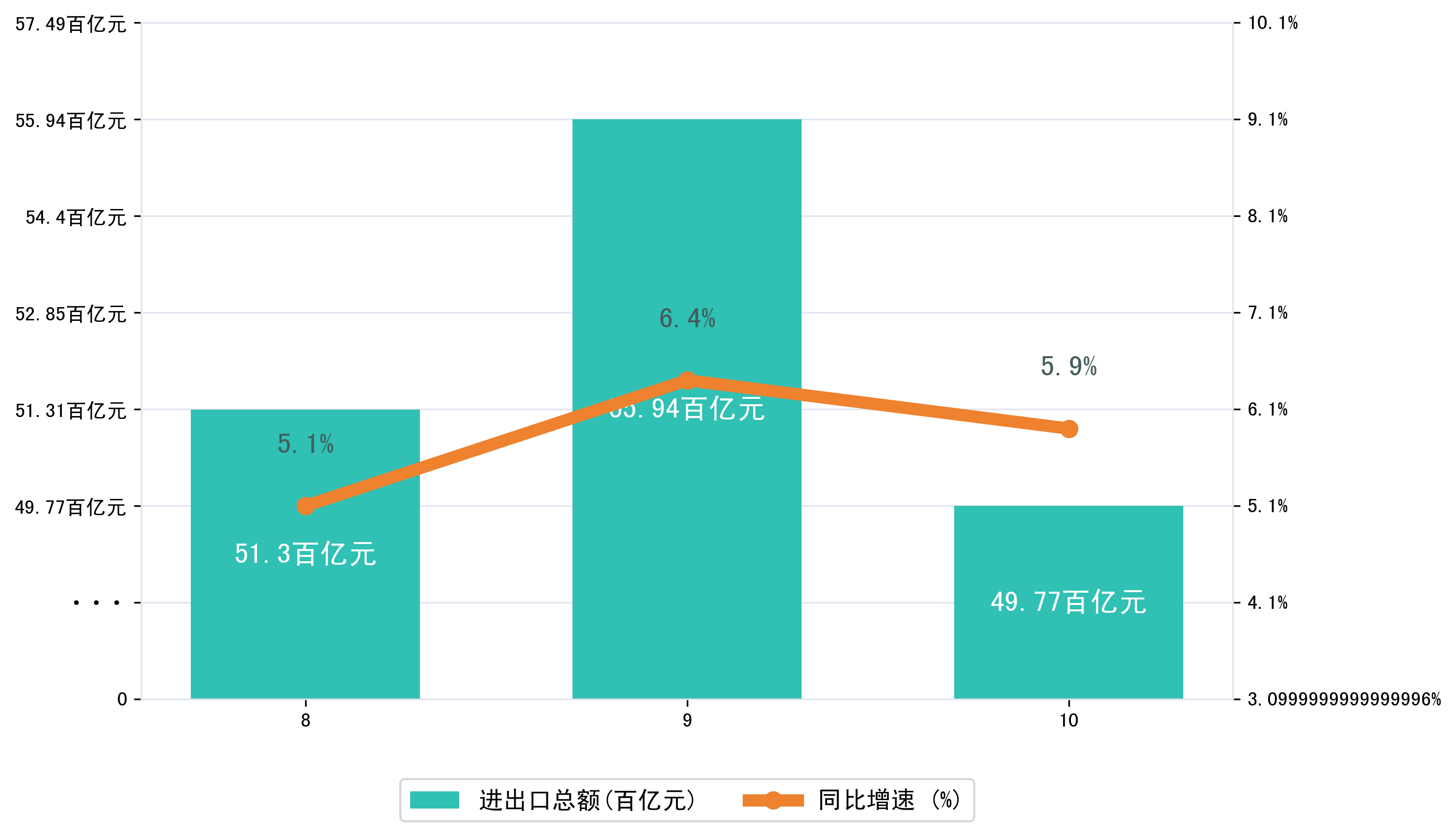 以人民币计,2025年10月江苏省进出口总额为4976,6329.6676万元,相比上月减少了617,5731.9839万元;相比上年同期增加了78,1410.4061万元,同比增加了5.90%。